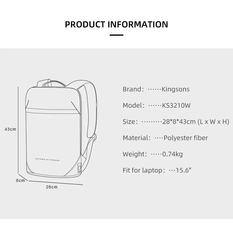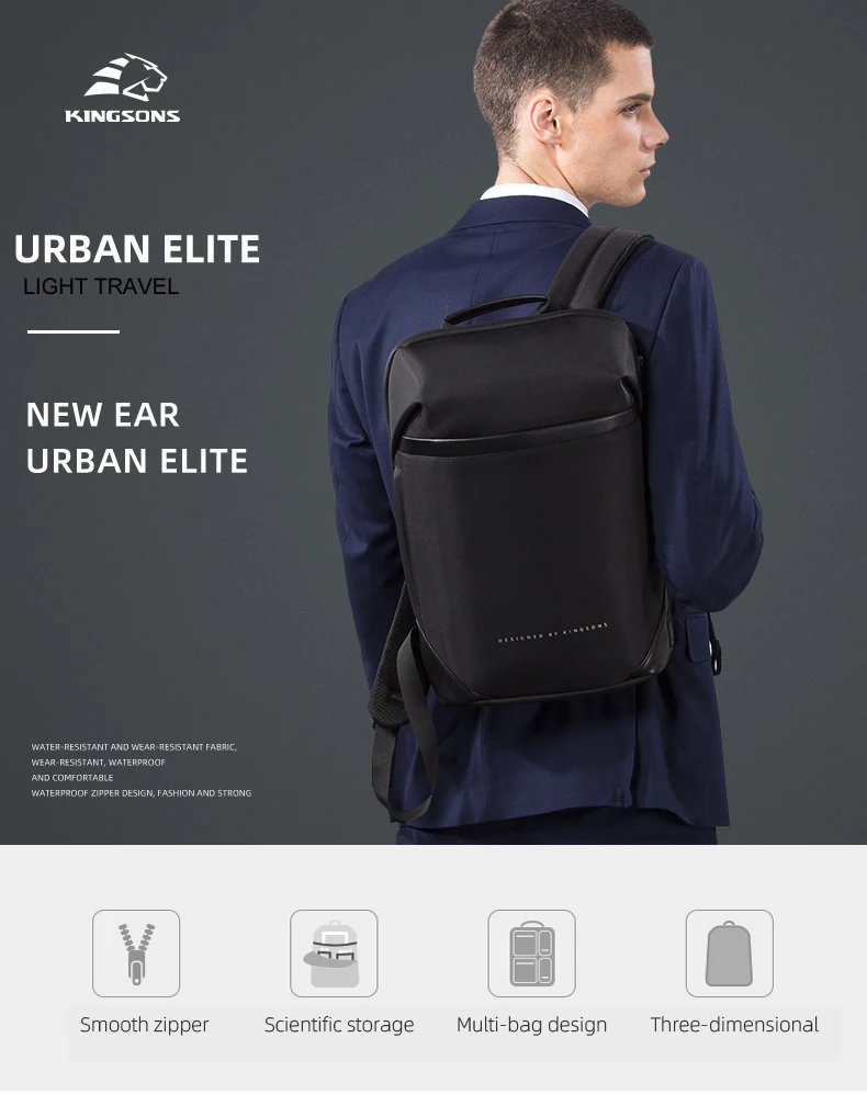 Бренд: Kingsons Ткань: полиэстер + кожа из микрофибры Модель: KS3210W Цвет: черный Внешний размер: 28 см * 8 см * 43 см 1. Ультратонкая декомпрессия и комфорт, вес всего 0,74 кг 2. Оригинальный дизайн, защита права патента (патент № : ZL201921191121.3), с косой вилкой зарядное устройство, эффективный и удобный 3. Водоотталкивающая и износостойкая ткань 4. Многослойное Сетчатое пространство, может вместить 15,4-дюймовый компьютер, a4 файл, мышь, зарядное устройство, внешний аккумулятор и другие предметы 5. Скрытый карман на молнии на спине, который может держать ценные вещи для личной безопасности 6 задняя часть выполнена из дышащей, гладкой трехзернистой плавки сетки, чтобы избежать трения и поднятия одежды 7. Багаж можно повесить на спинку