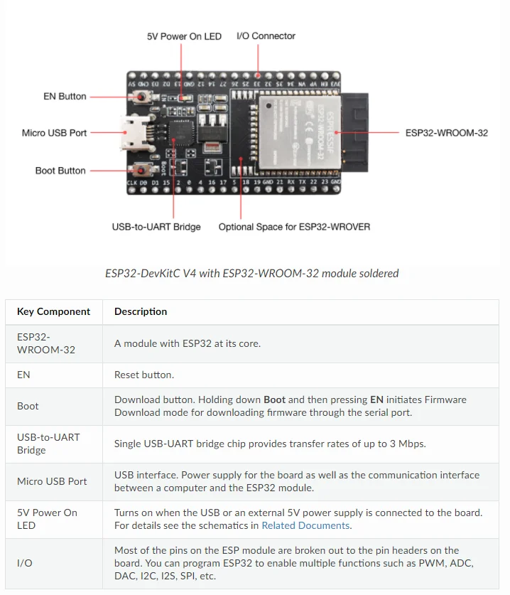 ESP32-DevKitC руководство по запуску V4 [] в этом руководстве показано, как начать использование ESP32-DevKitC платы развития v4. Описание других версий ESP32-DevKitC см. В Справочнике по аппаратному оборудованию esp32. То, что вам нужно, ESP32-DevKitC V4 Плата USB A/micro USB B Кабель компьютера под управлением Windows, Linux или macOS вы можете пропускать раздел введение и перейти непосредственно в раздел Запуск разработки приложений. Обзор ESP32-DevKitC V4-это макетная плата небольшого размера для ESP32-based, произведенная компанией Espressif. Большинство штифтов ввода/вывода разбиваются на штыревые разъемы с обеих сторон для легкого сопряжения. Разработчики могут подключать периферийные устройства с помощью перемычек или устанавливать ESP32-DevKitC V4 на макетную плату. Для того чтобы покрыть широкий диапазон требованиями пользователя, следующие версии ESP32-DevKitC V4 доступны: из-за разных ESP32 модули ESP32-WROOM-32 ESP32-WROOM-32D ESP32-WROOM-32U ESP32-SOLO-1 ESP32-WROVER ESP32-WROVER-B ESP32-WROVER-I ESP32-WROVER-B (IPEX) мужской или женский штыревые разъемы. Для получения подробной информации, пожалуйста, обратитесь к Espressif информация о заказе продукта. Функциональное описание на следующем рисунке и в таблице ниже описаны ключевые компоненты, интерфейсы и элементы управления ESP32-DevKitC платы v4.