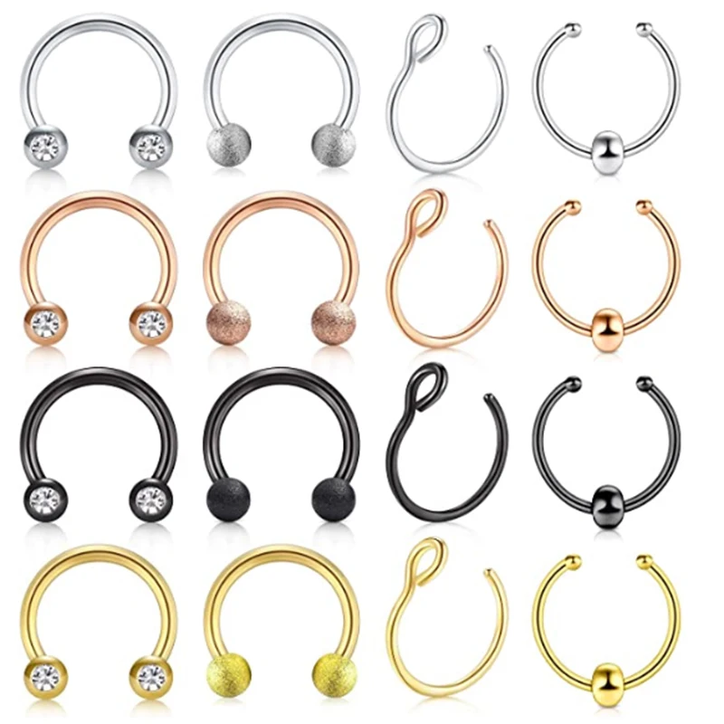 Моднявка = ckeditor: 16 шт. пирсинг носа/уха/губ кольца в 4 разных цветах, в том числе 4 шт CZ серьги на Козелок + 4 шт Матовый мяч изогнутый штанга + 4 шт кольцо для носа + 4 шт Поддельные кольца для носа с шариком.
