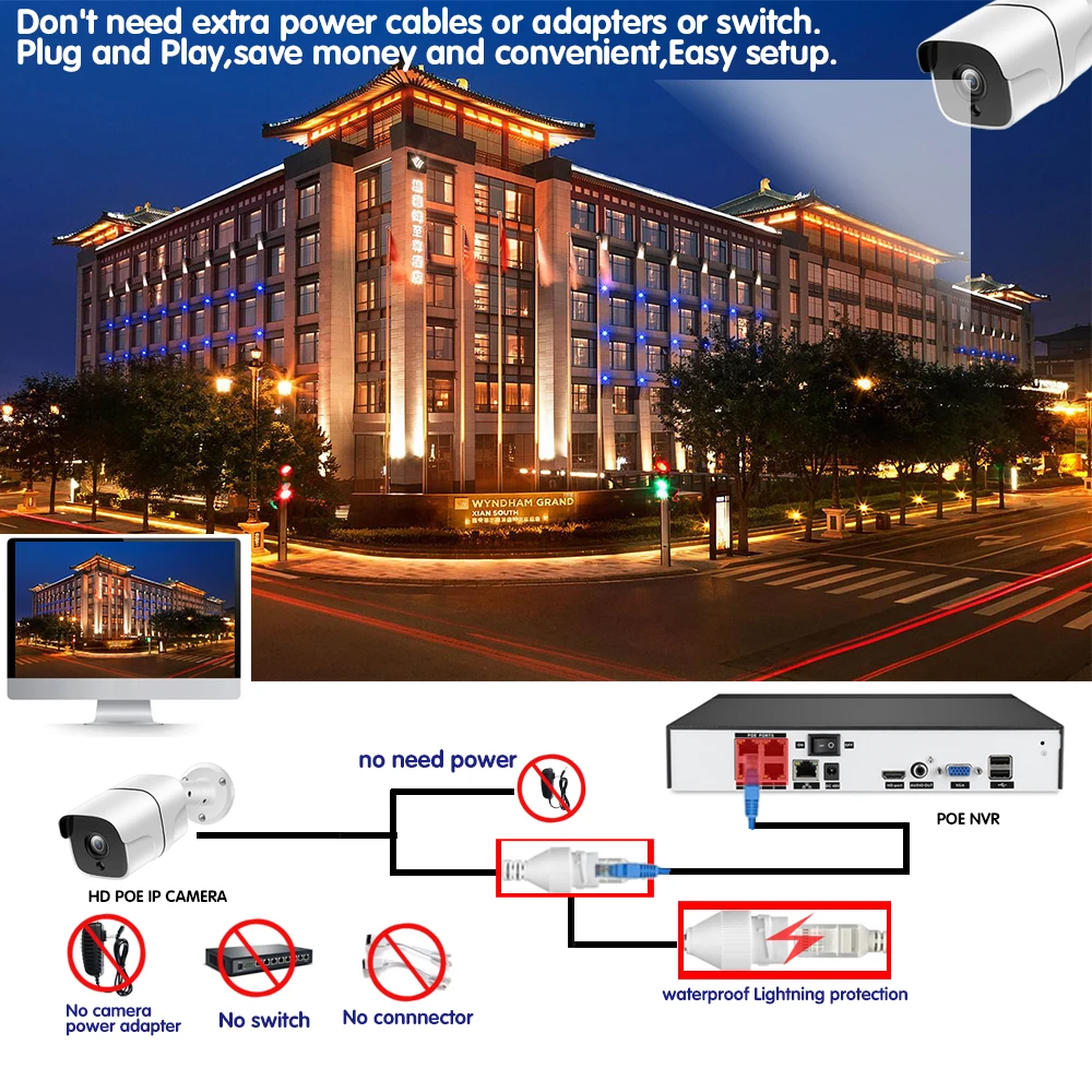 Нет дополнительных кабелей питания или адаптеров, просто подключив ip-камеру к NVR с помощью одного кабеля, вы можете легко завершить установку без знания о компьютере или сети и начать наслаждаться супер простым мониторингом среди вашего смартфона, планшета или ПК.