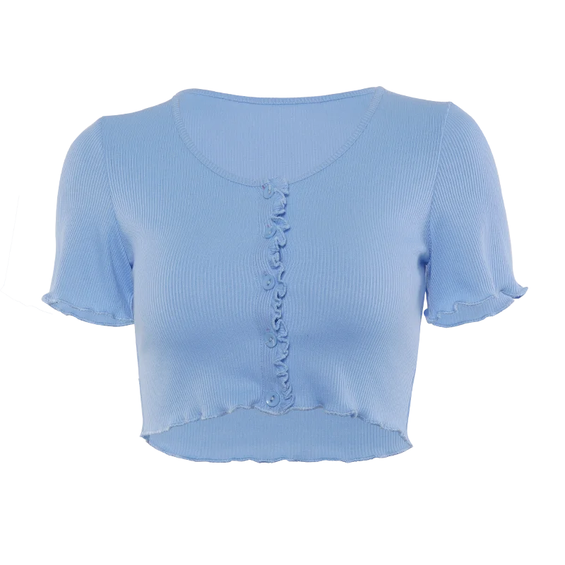 Женская футболка на пуговицах, привлекательная однотонная облегающая футболка с V-образным вырезом и коротким рукавом, Клубная верхняя одежда 2020, летняя одежда, Прямая поставка, футболка с оборкой