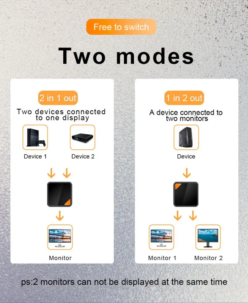 Этот двухнаправленный разветвитель/коммутатор позволяет подключить два источника HDMI к одному дисплею HDMI или подключить один источник HDMI для переключения между двумя дисплеями (будет отображаться только один монитор).