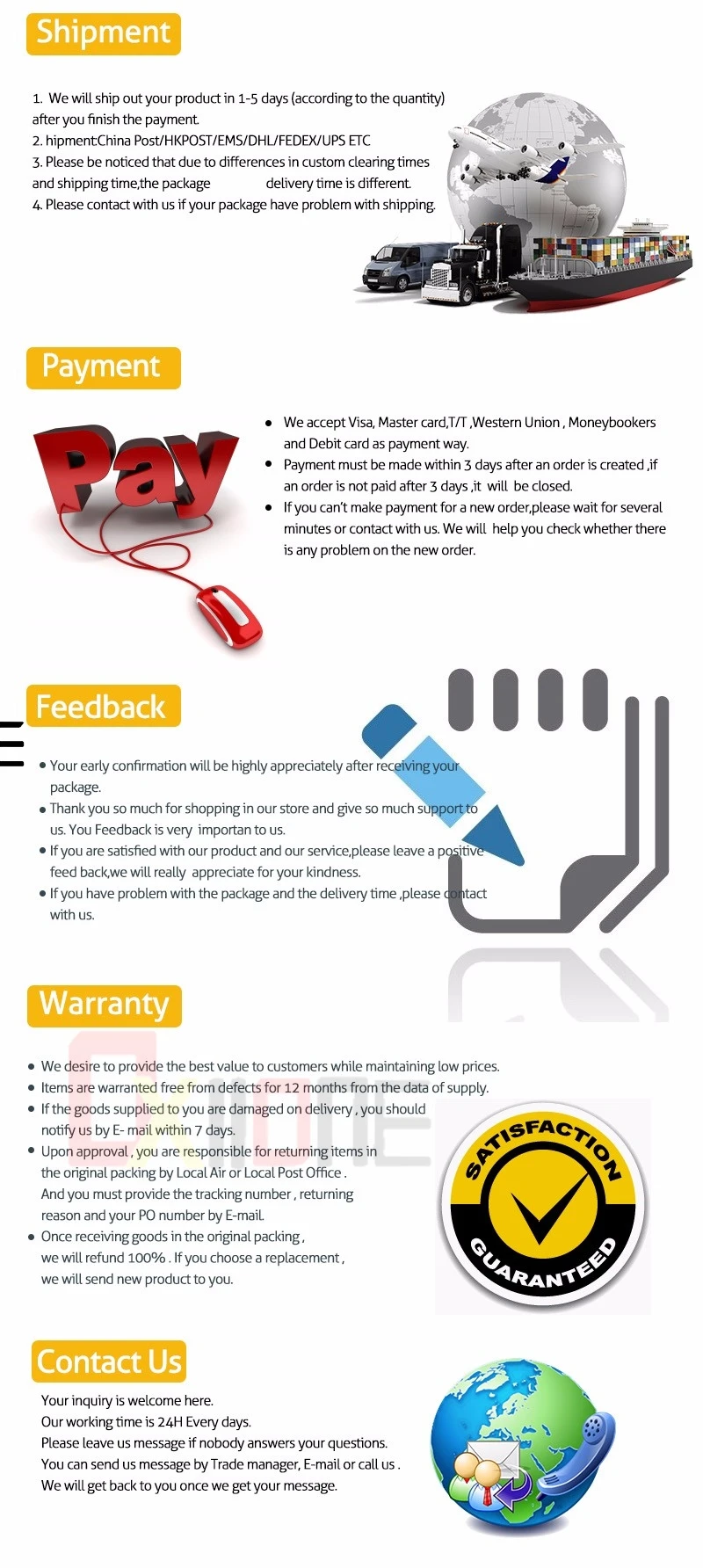 Если вы удовлетворены нашими продуктами и услугами, пожалуйста, дайте нам пять звезд отзывы. Если у вас есть какие-либо вопросы, пожалуйста, оставьте нам сообщение. Мы рады помочь вам решить проблему как можно скорее