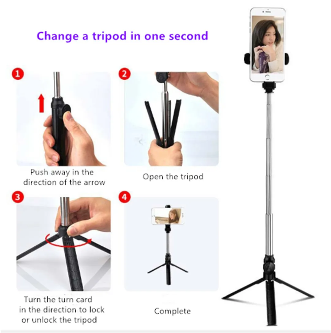 1. Селфи палка/штатив/пульт дистанционного управления три в одном многофункциональная селфи палка 2. Пульт дистанционного управления Bluetooth 10 м 3. Съемный пульт дистанционного управления Bluetooth 4. Легкий и удобный для переноски 5. Одно касание хранения/Bluetooth съемки/Устойчивый Штатив/пульт дистанционного управления