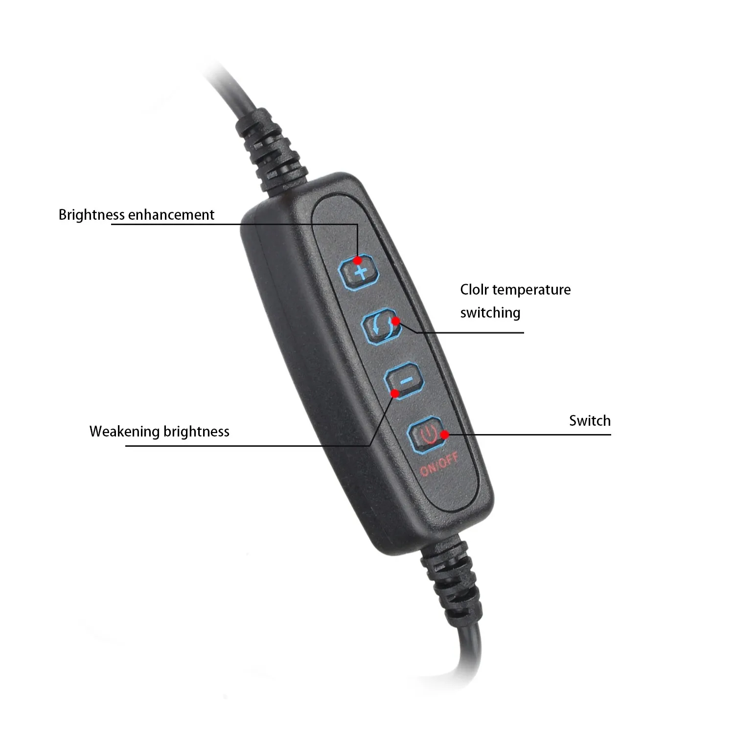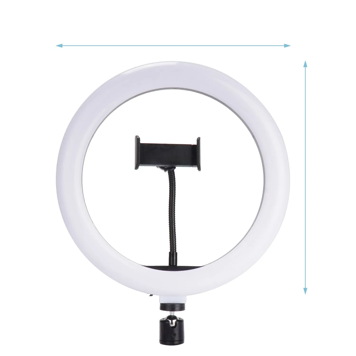 Характеристики: Светильник источник света: светодиодный SMD Форма: Кольцо Внешний диаметр: 26 см/10 дюймов Общая мощность: 5 Вт Цветовая температура: 5500K Регулировка яркости: Да Диапазон затемнения: 1%-100% Общее освещение: 3600LM CRI (индекс цветопередачи): >83 Адаптер: Универсальный Материал: пластик Посылка включает: 1x26 см светодиодный кольцевой светильник Шаровая Головка-1 шт. 1 x держатель для телефона