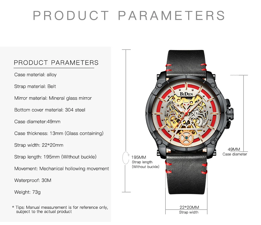 Чехол Материал: сплав Материал ремешка: стальной ремешок Материал зеркала: минеральное стекло Материал нижней крышки: сталь 304 Чехол диаметр: тонкий УФ-фильтр 49 мм Чехол Толщина: 13 мм Ядро: механизм Дэн Донг Предотвращение воды: 30 м Вес: 73 г Посылка включает в себя: 1 x часы BIDEN. 1 Оригинальная бархатная сумка для часов BIDEN. 1 x Руководство пользователя с гарантийной картой. 1 х тканевая салфетка для чистки часов. Особенности: 3 АТМ Водонепроницаемость (ежедневная Ручная стирка и дождь в порядке, дайвинг и плавание не поддерживаются.) С хронографом (секундомером) и светящейся функцией, с отображением даты; Идеально подходит для любого вида бизнеса, повседневного, спортивного, внутреннего или повседневного использования.