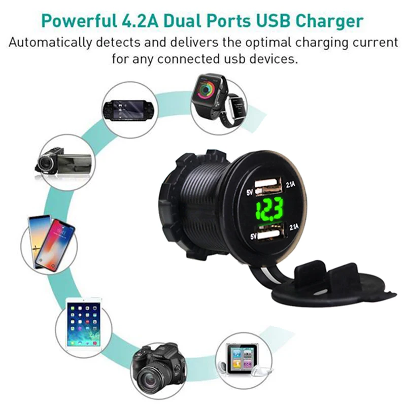 Это зарядное устройство USB подходит для DC 12-24V автомобиля, лодки, морской, мотоцикл, ATV, RV и т. Д.