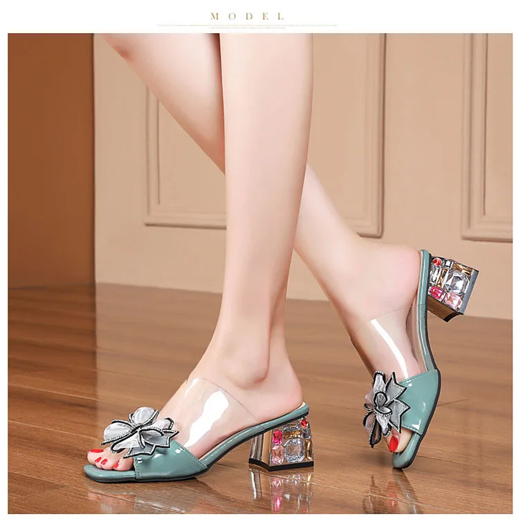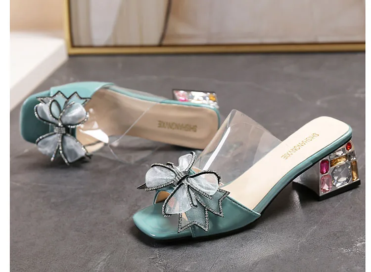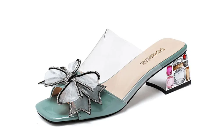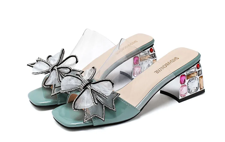 Женские летние шлепанцы; Модные Босоножки на каблуке с кристаллами; Босоножки с бантиком; Женские шлепанцы на высоком квадратном каблуке; Прозрачные прозрачные шлепанцы; 2020