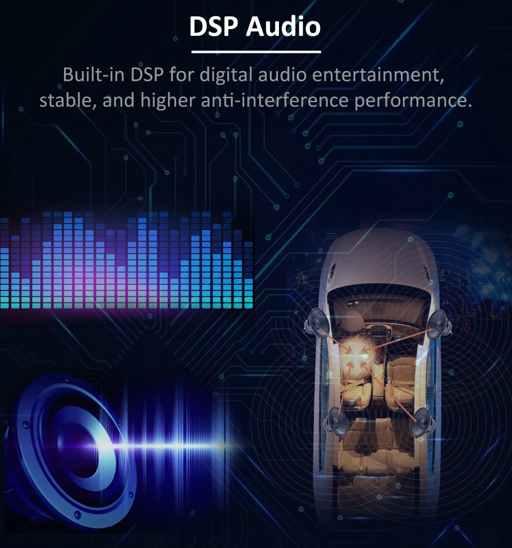 DSP (цифровой обработки звукового поля) характеристики полностью цифровой чип обработки, и мощной инженерно-56-бит двойную точность режим, чтобы отрегулировать аудиосигнал при помощи во всех аспектах, также поддерживает максимальную выходную мощность 4x45 Вт, что делает музыку более широкой и более реалистичной.