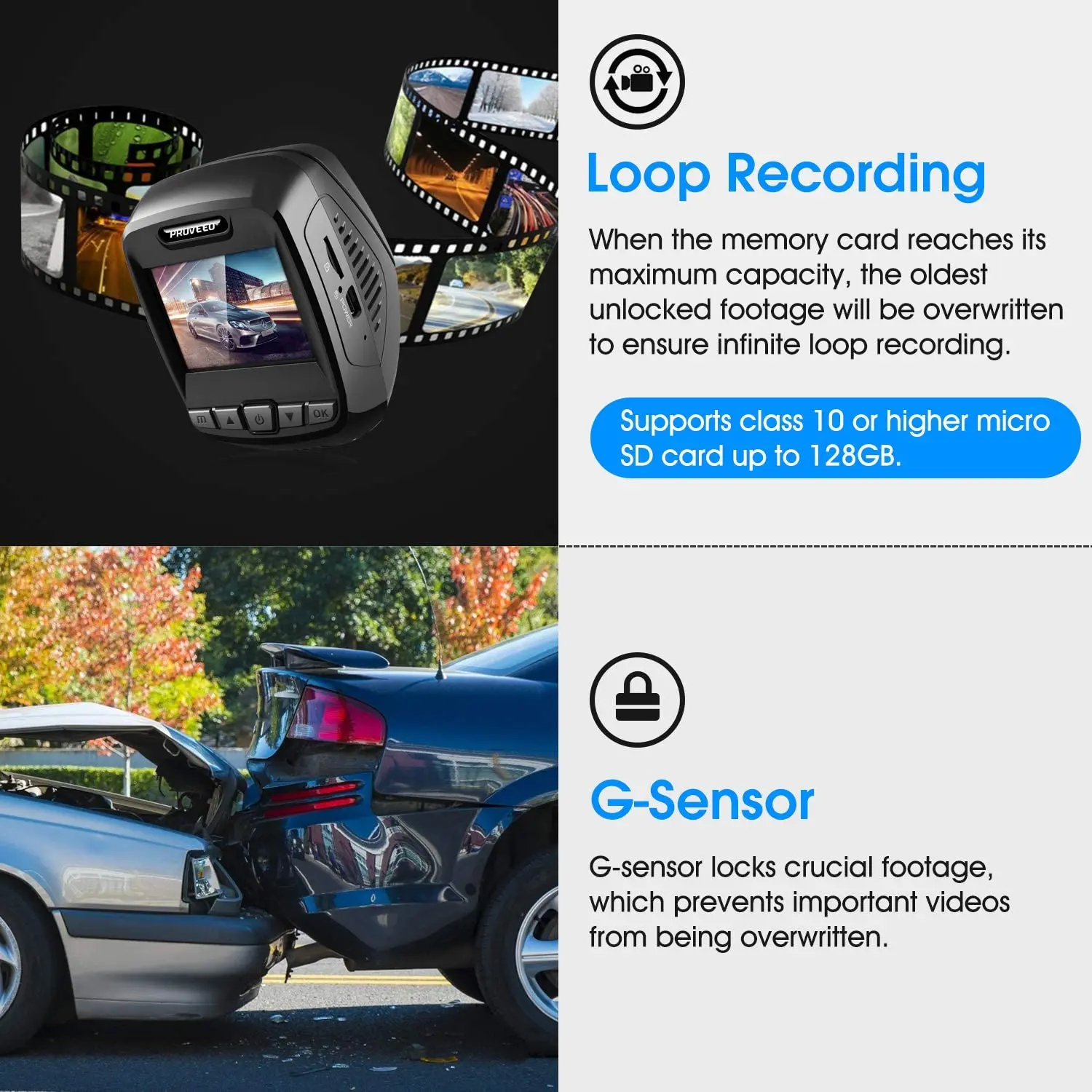 [Запись 4K ULTRA HD]: запись видео до разрешения 2160P. Широкий динамический диапазон позволяет камере работать оптимально в любой ситуации освещения путем регулировки экспозиции для создания сбалансированного изображения. [Встроенный WIFI]: с поддержкой функции Wi-Fi и приложения просто откройте приложение и подключите видеорегистратор через Wi-Fi для просмотра видео в реальном времени или воспроизведения видео. [Встроенный gps-регистратор]: Отслеживайте свои путешествия: Встроенный gps-регистратор, записывает данные своего местоположения, чтобы вы могли видеть маршруты, которые вы выбрали. Отслеживание маршрута GPS на картах Google. [Суперконденсатор]: мощность поставляется суперконденсатором, отличается повышенной термостойкостью к жаркому и холодному климату. [Автоматическое Обнаружение аварий (G-SENSOR)]: когда датчик G обнаруживает столкновение, текущее видео заблокировано, обеспечивая защиту важных кадров. Видеорегистратор Pruveeo T7 Циклическая запись: при достижении лимита памяти на карте памяти новая запись s автоматически перезаписывает старые записи. 170 градусов широкий угол для уменьшения слепых пятен. Широкий F1.8 апертура объектива камеры пропускает больше светильник для того чтобы произвести более чёткие кадры даже в условиях низкой светильник условия. 2,4-дюймовый ЖК-дисплей Экран является еще одним выгоды, что дает вам кристально чистое дисплей. Видеорегистратор работает автоматически. Он начинает запись, когда двигатель включен и останавливается, когда он выключен. Циклическая Интервальная запись на карту micro SD. Бесшовная запись означает отсутствие зазоров между записанными файлами. Легкая Установка. Камера легко крепится на лобовое стекло с помощью прилагаемого крепление на клейкой основе 3M комплектов.