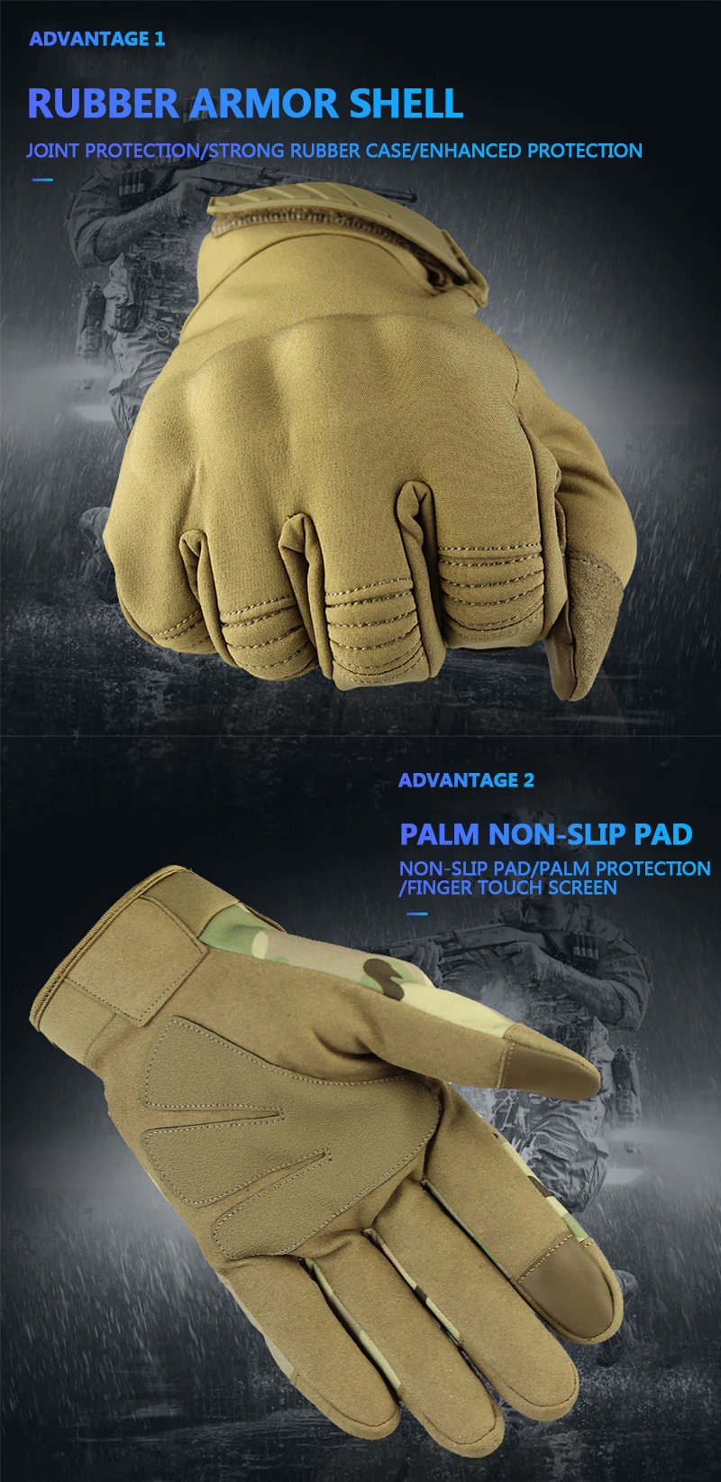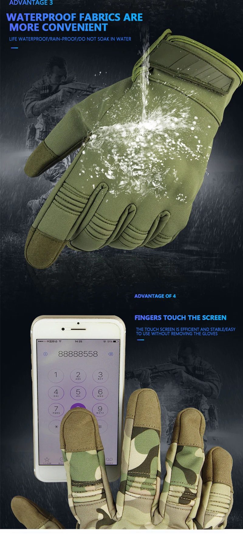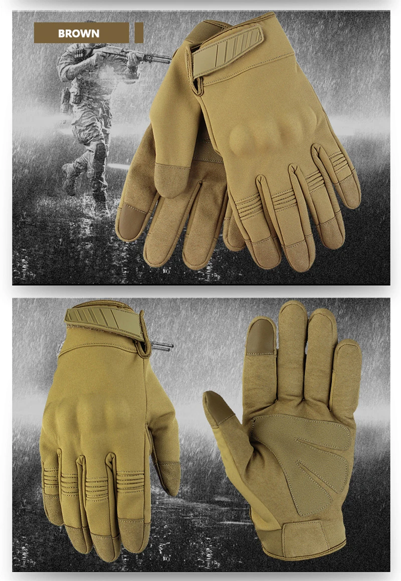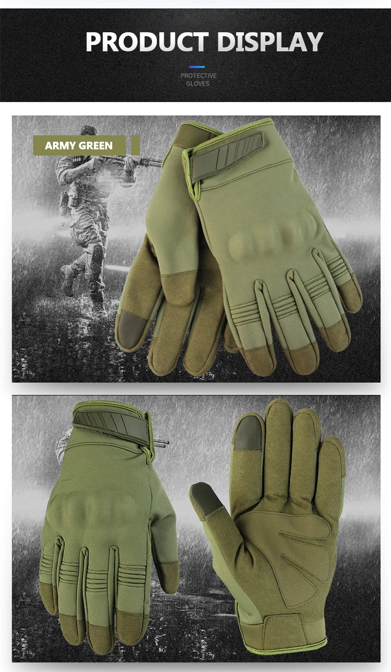 Спецификация: Материал: полиэстер и хлопок Цвет: черный, зеленый, коричневый, камуфляж Пол: унисекс Размер: S/M/L/XL Особенности: 1. Дизайн регулировки запястья дьявола. Пусть перчатку не легко отвалить 2. Прочный, мягкий и гибкий, удобный и дышащий 3. Подходит для мотогонок, езды по бездорожью, рыбалки, альпинизма и других видов спорта на открытом воздухе 4. Сенсорный экран, чувствительный для прикосновения к телефону. Посылка включает: 1 пара перчаток