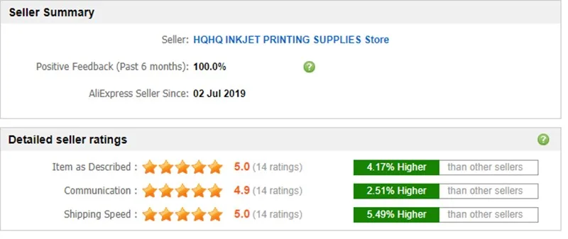 Магазина HQHQ INKJET PRINTING Store работает с 03.07.2019. его рейтинг составлет 76.92 баллов из 100. В избранное добавили 291 покупателя. Средний рейтинг торваров продавца 4.2 в продаже представленно 907 наименований товаров, успешно доставлено 102 заказов. 52 покупателей оставили отзывы о продавце.