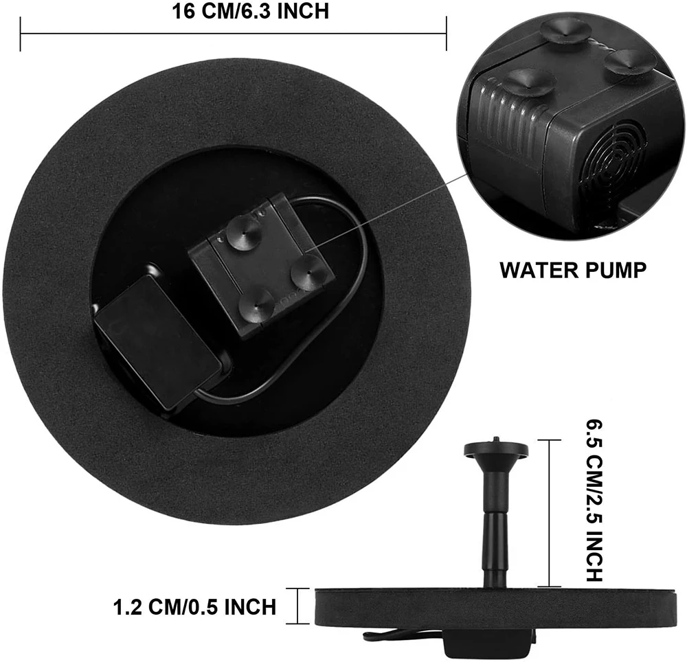 Панели солнечные: 7V/1,4 W Панели солнечные Диаметр: 16 см (6,3 дюйм (ов) Бесщеточный насос Вход: DC 4,5-10V Максимальный расход насоса: 180 л/ч Максимальная высота распыления воды: 70 см (27,5 дюйма), обычная: 10 ~ 15 дюймов Вес: 8,11 унций Минимальная глубина воды в фонтане должна быть 1 3/4" Срок службы:> 20000 часов Задержка: ≤ 3s