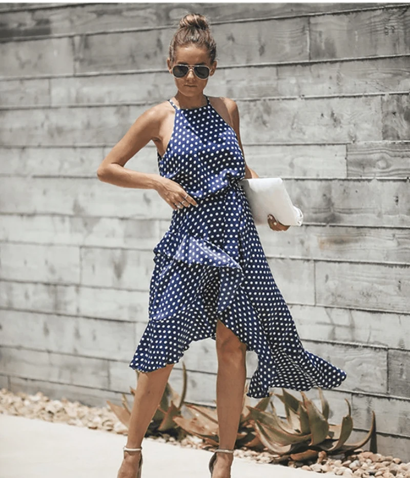Женское винтажное платье в горошек Anbenser, летнее асимметричное платье без рукавов с оборками и лямкой на шее, платья средней длины для женщин