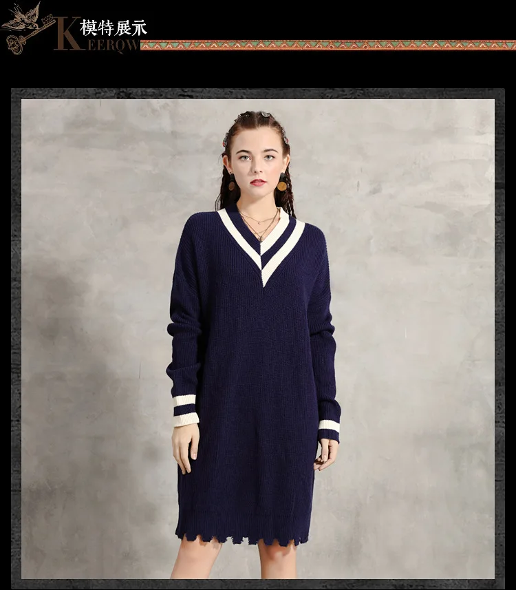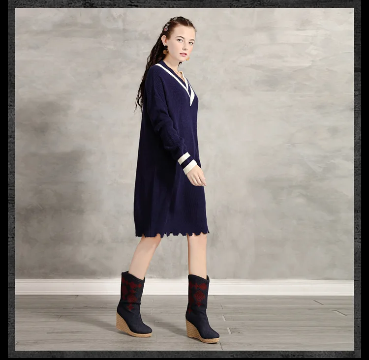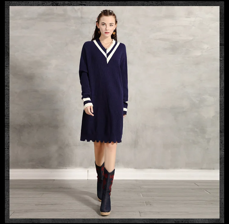 Европейская и американская женская зимняя одежда 2020 Новое свободное вязаное ретро контрастное цветное платье с v-образным вырезом