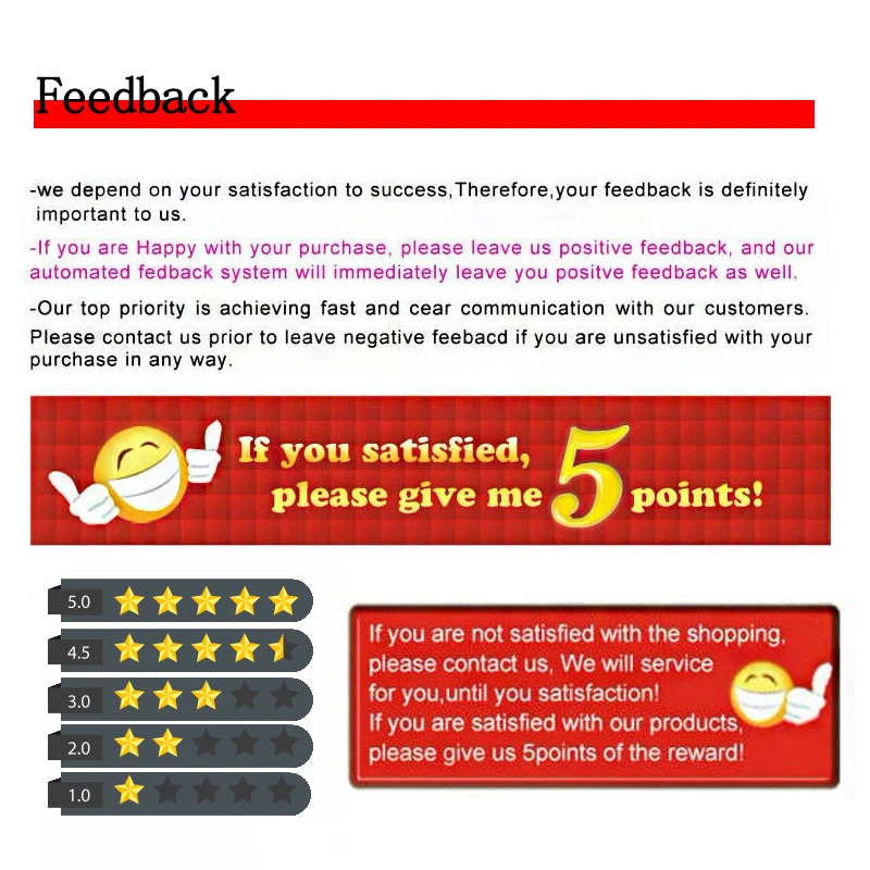 "Уровень удовлетворенности: Удовлетворение клиента-наша главная цель. Ваши положительные комментарии очень важно для нас! Если вы не удовлетворены, вы можете связаться со службой поддержки клиентов, чтобы решить эту проблему, мы решим проблему как можно скорее"