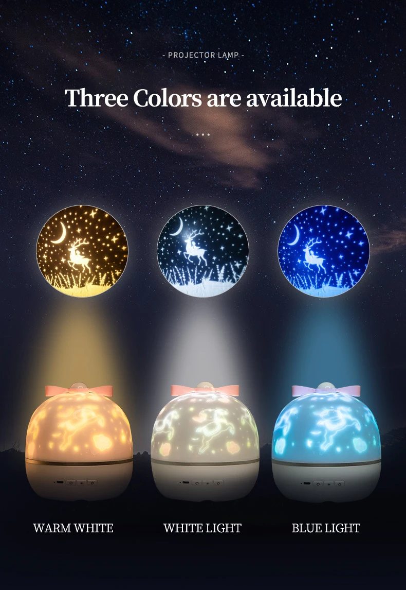 Название: Поворотный Звездный проектор ночной Светильник Стили: 6 Регулируемых эффектов проекции, 3 светодиодный светильник цвета (теплый белый, синий, желтый). Размер изделия: 131 мм * 131 мм * 136 мм Емкость аккумулятора: 1200 мАч Материал: АБС-пластик + Поликарбонат Режим питания: подключение USB Посылка Содержание: 1 * Ночной светильник Star Projector 6 * проекционная пленка (подводный мир и волшебная Вселенная и вращающийся Троян и счастливый день рождения, Розовый сад и счастливый олень) 1 * USB кабель 1 * Руководство пользователя