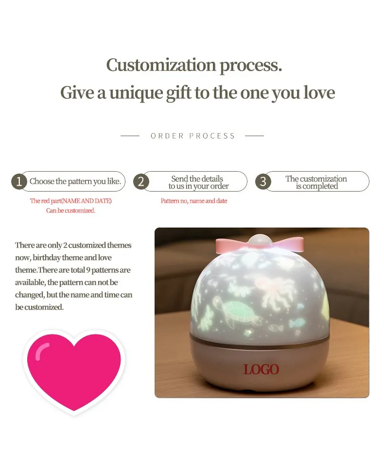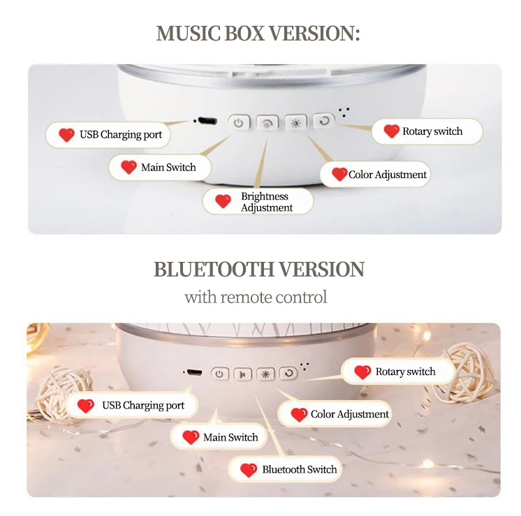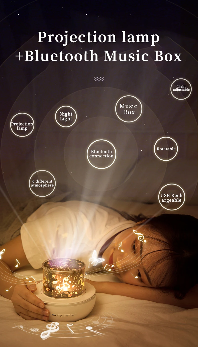 1. Есть два режима для этого прожекторного светильник, режим музыкальной шкатулки и музыкальный режим Bluetooth. Музыкальная шкатулка имеет только одну очень Римскую песню (замок в небе), Режим Bluetooth может подключаться к ваш мобильный телефон и наслаждаться любой приятной музыкой с вашего телефона. 2. Шесть различных пленок Звездный ночной Светильник проектирует волшебную вселенную, подводное море океана, вращающийся Троян, счастливый день рождения и розовый сад, счастливый олень вокруг комнаты, тем самым превращая комнату в расслабляющую Среду ночью. Это дает вашим детям комфорт и ощущение расслабления ночью, помогая им избавиться от боязни ночью. Это также позволит вам насладиться романтическим моментом с вашим партнером. 3. Регулировка атмосферы Если вы хотите добавить что-то особенное для вашего дня рождения, праздника, свадьбы или другого счастливого случая, который требует атмосферы, ночной светильник-проектор станет идеальным выбором 6 различных тем, проектирующий светильник, и 3 цвета праздничный светильник, который поможет вам поднять атмосферу вечеринки. 4. Встроенный светодиодный бисер нового поколения, который имеет более четкую проекцию на стенах или потолке. Вращение на 360 градусов делает сцены более яркими и интересными 5. Лампа имеет два режима, может быть Ночной светильник или лампа проектора, также может менять цвета от одного до нескольких цветов. 6. Настраиваемые подарки. Напечатайте имя вашего любимого на лампе и Подарите ей самый уникальный подарок. Примечание: Пожалуйста, не используйте usb-кабель и аккумуляторы одновременно, мы советуем вам использовать usb-кабель, если вы используете Ночной светильник более 30 мин. Лампа может быть Ночной светильник или лампой. В том случае, если вы этого не сделаете снимите верхнюю крышку, это будет Ночной светильник в том, что чехол. И если вы удалите верхнюю крышку, это будет лампа проектора.