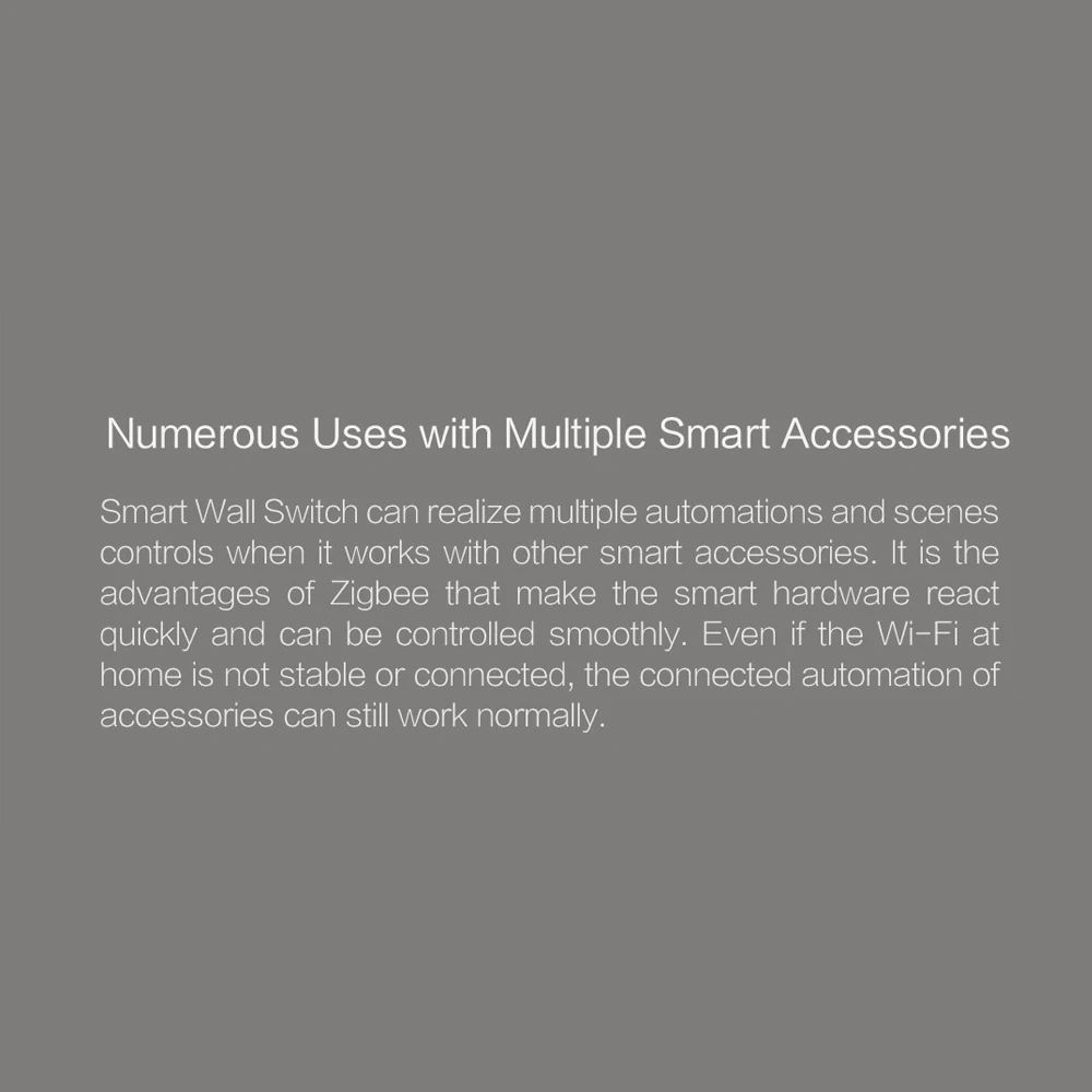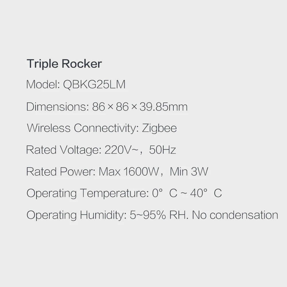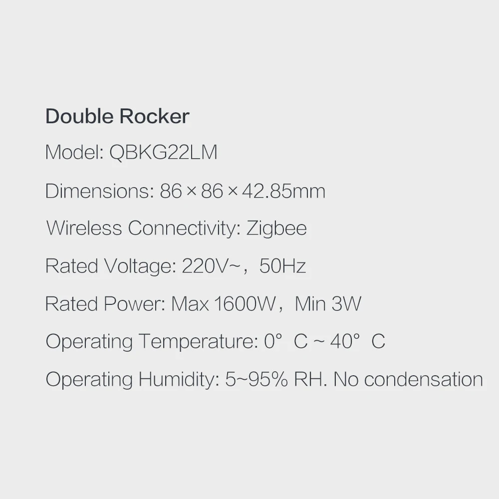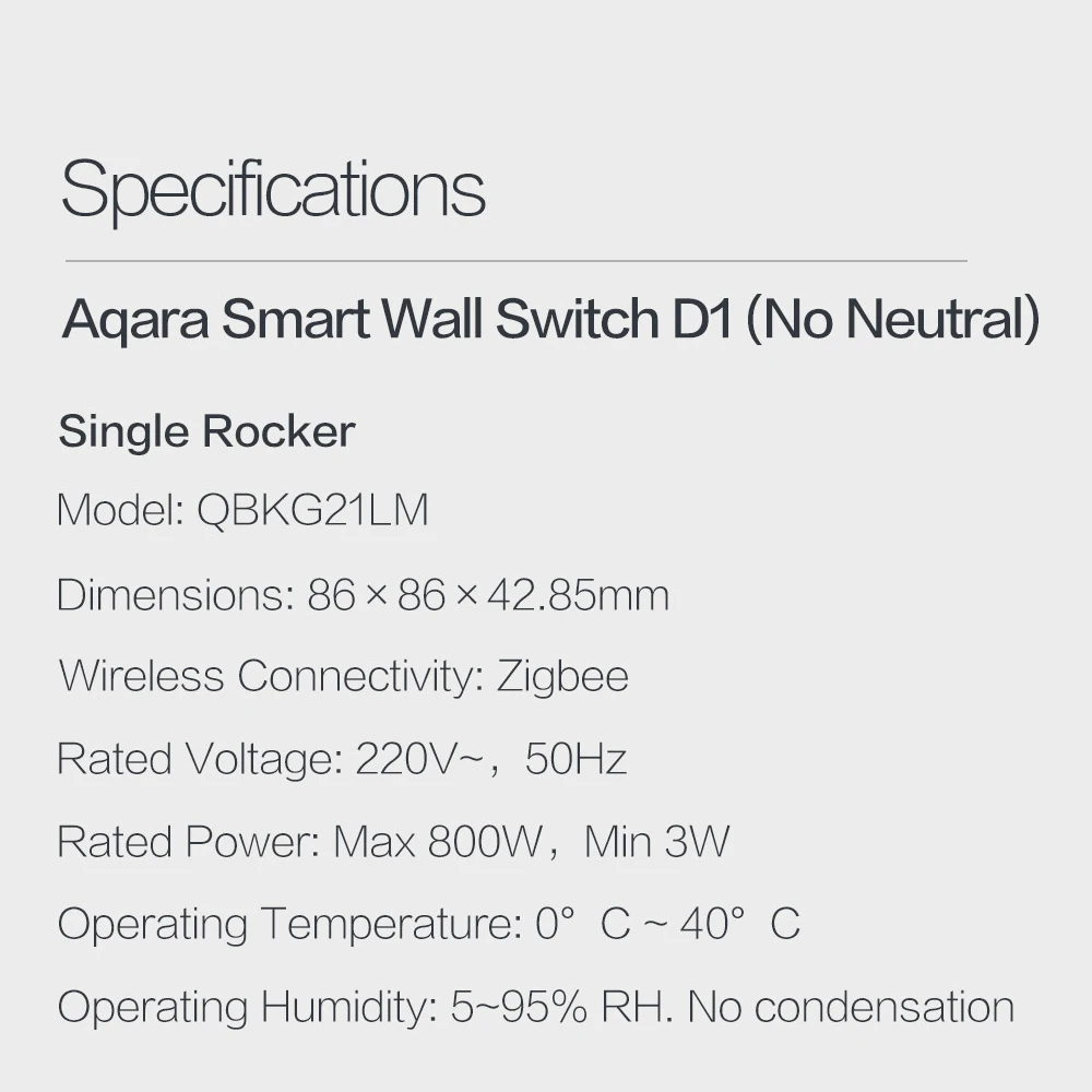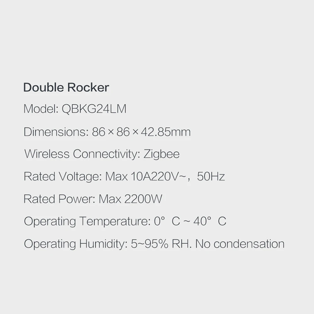 Примечание: этот коммутатор должен работать с шлюзом для достижения функции интеллектуального дистанционного управления Особенности: * Не может быть проводным, только может управлять умной лампой Xiaomi или светом через ZigBee * Портативный, осуществляет контроль везде * Может использоваться в качестве ключевого дверного звонка * Экстренный вызов SOS * Функция защиты и снятия * Беспроводной частота: 2,4 ГГц (2400-2483,5 МГц) * Беспроводное подключение: ZiGBee * Встроенный CR2032 батарея * Пожалуйста, загрузите приложение «Mi Home'' в Google Play или APP Store Описание продукта: Примечание: настенный выключатель может подключать провод, может контролировать любую лампу; В то время как беспроводная клавиша не может быть проводной, можно управлять только умной лампочкой xiaomi или светом через ZigBee. 2) умный настенный выключатель Aqara D1 (без нейтрального) Single Rocker Модель: QBKG21LM Размеры: 86x86x42,85 мм Беспроводное подключение: Zigbee Номинальное напряжение: 220 В --, 50 Гц Номинальная мощность: макс 800 Вт, мин 3 Вт Рабочая температура: 0 °C ~ 40 °C Рабочая влажность: 5 ~ 95% относительной влажности. (Без конденсации) Двойной рокер Модель: QBKG22LM Размеры: 86x86x42,85 мм Беспроводное подключение: Zigbee Номинальное напряжение: 220 В ~,50 Гц Номинальная мощность: Макс 1600 Вт, мин 3 Вт Рабочая температура: 0 °C ~ 40 °C Рабочая влажность: 5 ~ 95% относительной влажности. (Без конденсации) Тройной рокер Модель: QBKG25LM Размеры: 86x86x39,85 мм Беспроводное подключение: Zigbee Номинальное напряжение: 220 В ~, 50 Гц Номинальная мощность: Макс 1600 Вт, мин 3 Вт Рабочая температура: 0 "C ~ 40 C Рабочая влажность: 5 ~ 95% относительной влажности. (Без конденсации) 3) умный настенный выключатель Aqara D1 (с нейтральным) Single Rocker Модель: QBKG23LM Размеры: 86 x 86x 42,85 мм Беспроводное подключение: Zigbee Номинальное напряжение: Макс 10A220V ~, 50 Гц Номинальная мощность: макс. 2200 Вт Рабочая температура: 0 "C ~ 40" C Рабочая влажность: 5 ~ 95% относительной влажности. (Без конденсации) Двойной рокер Модель: QBKG24LM Размеры: 86x86x42,85 мм Беспроводное подключение: Zigbee Номинальное напряжение: Макс 10A220V ~, 50 Гц Номинальная мощность: макс. 2200 Вт Рабочая температура: 0 "C ~ 40 C Рабочая влажность: 5 ~ 95% относительной влажности. (Без конденсации) Тройной рокер Модель: QBKG26LM Размеры: 86x86x39,85 мм Беспроводное подключение: Zigbee Номинальное напряжение: Макс 10A220V ~, 50 Гц Номинальная мощность: макс. 2200 Вт Рабочая температура: 0 "c ~ 40 C Рабочая влажность: 5 ~ 95% относительной влажности. (Без конденсации).