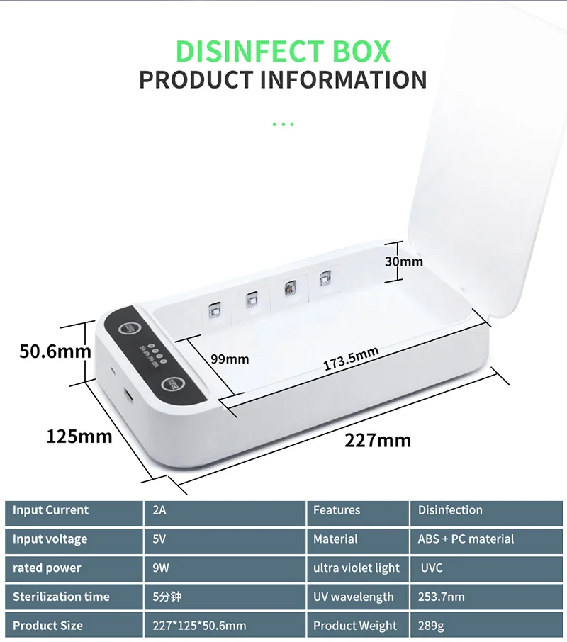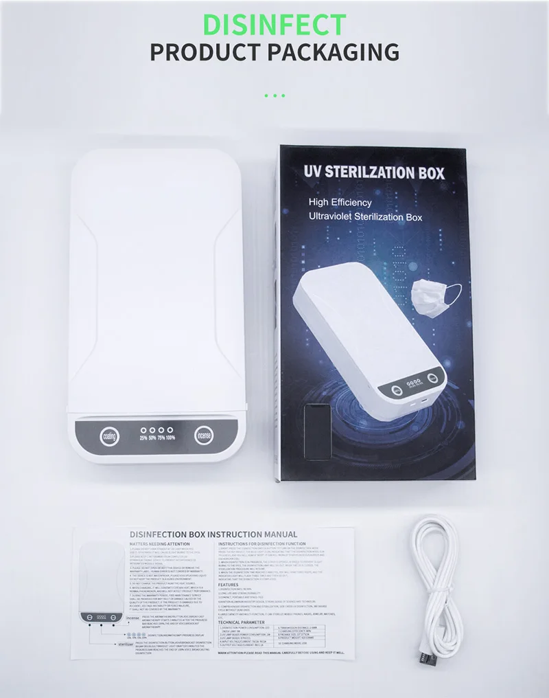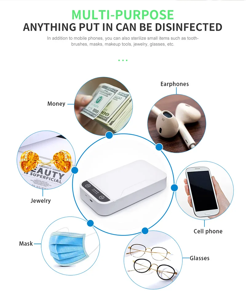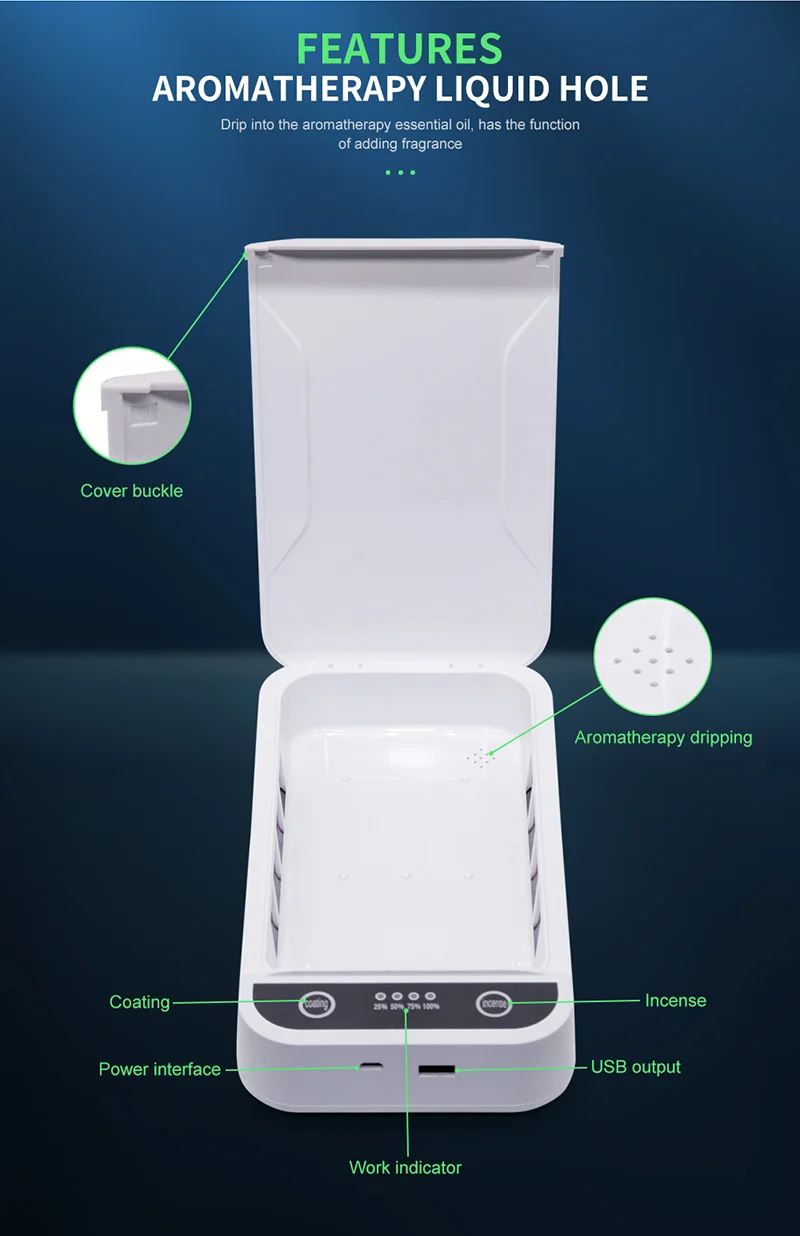 1. Уровень дезинфекции: 99.99% 2. Длительный срок службы и высокая прочность. 3. Портативный и свободный от пространства. 4. Авиационный алюминиевый промышленный дизайн, сильное чувство науки и техники. 5. Комплексная дезинфекция и стерилизация, боковая перекрестная УФ-дезинфекция, 360 градусов цикл без мертвых концов. 6. Большая вместимость и, многофункциональный, подходит для стерилизации мелких предметов, таких как мобильные телефоны, маски, часы, ювелирные изделия, ключи, наушники и т. Д.