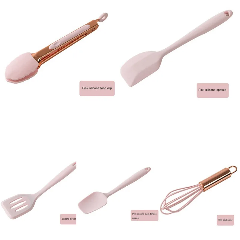 Название: кухонный инструмент для выпечки Материал: силикон, нержавеющая сталь с медным покрытием Зажим для еды 21 см 70 г Скребок 21 см 40 г Лопата с шлицем 20,5 см 38 г Скребок для утиного языка 20,5 см 48 г Взбиватель яиц 16,5 см 30 г Особенности: теплыми цветами, супер высоким соотношением цены и качества кухонные приспособления для выпечки изготовлены из пищевого силикона, устойчивость к воздействию высоких температур очень практична.