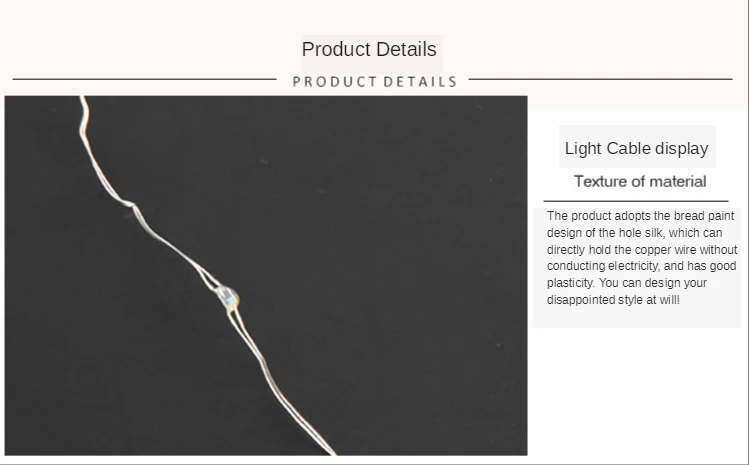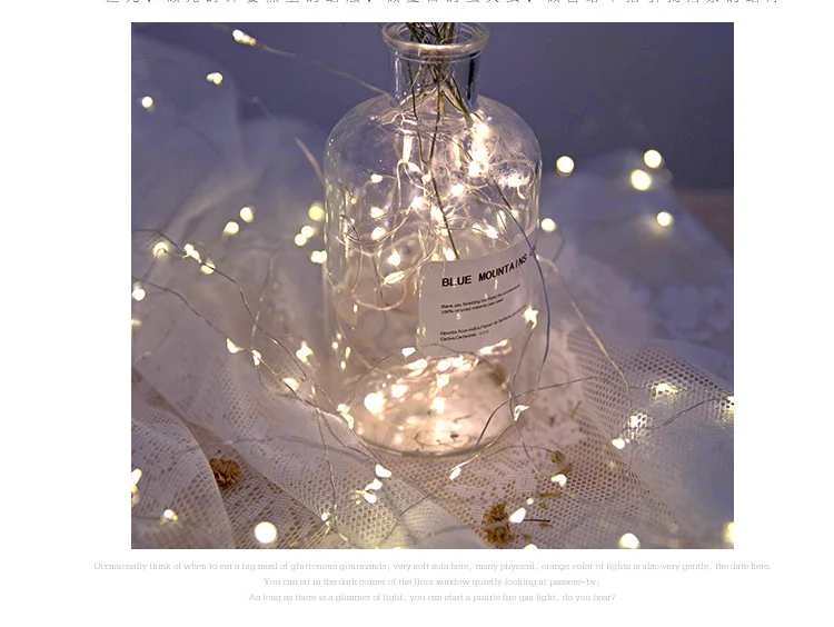 Название продукта: светодиодный светильник на медной проволоке с кнопками Цвет провода: серебристый Характеристики продукта: 1 м 10 светодиодов Цвет света: теплый светильник, белый светильник, красный светильник, зеленый светильник, желтый светильник, синий светильник, фиолетовый светильник, четыре цвета Интервал между светодиодами: 10 см Питание: 2 батарейки CR2032 (батарейки CR2032 не входят в комплект) Водонепроницаемый уровень: IP65, может быть непосредственно брошен в воду Примечание: кнопочный аккумулятор фонаря не является водонепроницаемым. Пожалуйста, оберните кнопочный аккумулятор для использования вне помещения, чтобы предотвратить попадание воды.