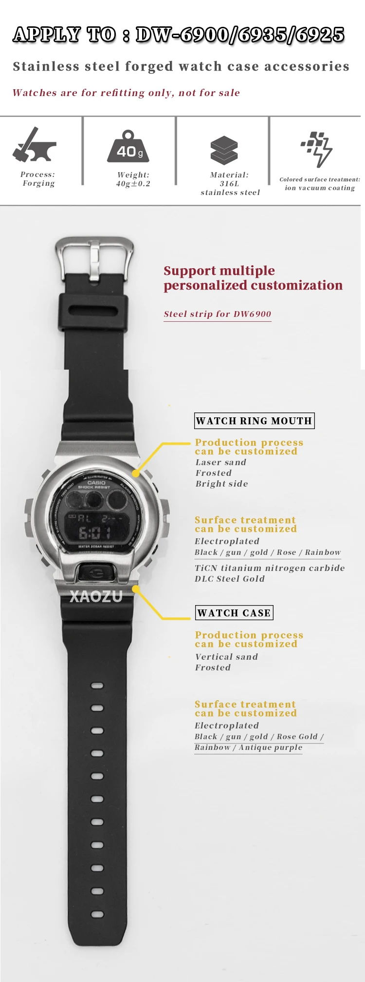 Материал: 100% 316L нержавеющая сталь Вес: часы набор-134,1 г; Рамка для часов-38,9 г; Ремешок-95,2 г Цвета: черный, серебряный, золотой, синий, золотой, Радужный Модель: DW6900 Посылка включает в себя: Есть два sku в Эта ссылка для вас на выбор 1. Посылка набора часов: Безель часов + ремешок для часов + Бесплатные инструменты для установки; 2. Часы чехол посылка: часы чехол + Бесплатные монтажные инструменты; DW6900 часы набор 5 цветов доступны модификации ободок 316L Нержавеющая сталь аксессуар Браслет для наручных часов