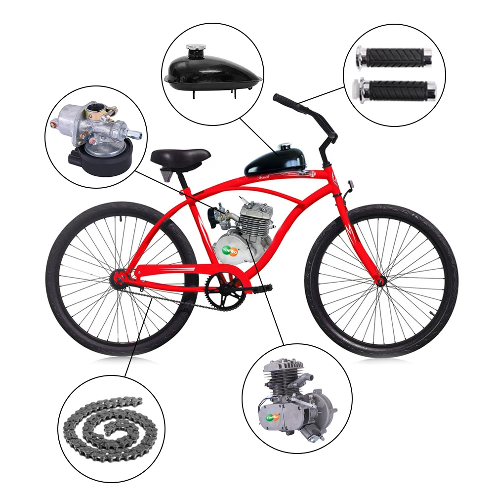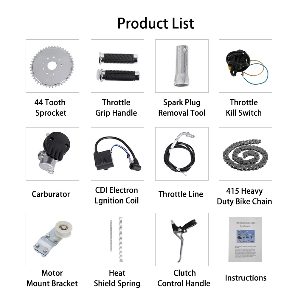 2-тактный двигатель 80cc-1 шт. 1 х черный газовый бак (2Л) Карбюратор-1 шт. 1 x Блок зажигания CDI 1 х Дроссельный кабель 1 x рукоятка управления дроссельной заслонкой на руле 1x44T оцинкованная цепная звездочка 2x9-hole зажимные колодки 1 x петпетух клапан 1 x стандартная велосипедная цепь 1 х крышка цепи 1 х глушитель 1 x направляющая цепь 1 х нажимной рычаг сцепления 1 х штепсельная вилка sparks 1 спидометр 1 х Руководство