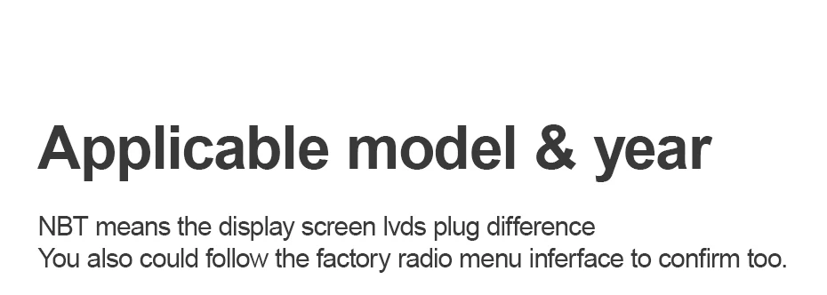 >>> Примечание: NBT просто есть экран дисплея lvds 6-контактный разъем >>> Выберите год выпуска автомобиля или оригинальное экранное меню заводского головного устройства. >>> Для BMW X1 F48 (2016-2017) NBT >>>For BMW X1 F48 (2018- ) EVO