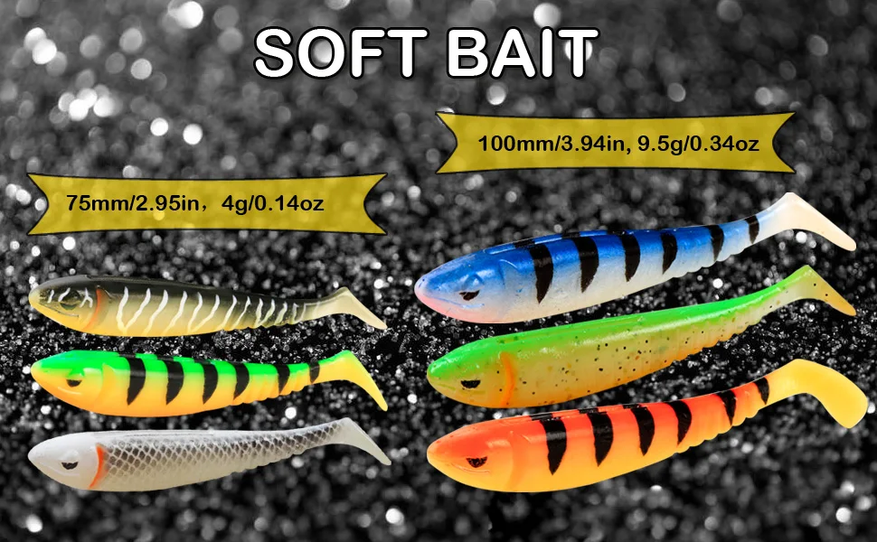 Длина: 75 мм, 100 мм Вес: 4 г, 9,5 г Цвет: 9 цветов, цвет s Кол-во: 10 шт., 6 шт. Материал: экологически чистый материал Экологически чистый материал s: изготовлен из материала, импортированного из Германии, водорастворимого, а также не содержит Бисфенол А, что является гораздо безопасной альтернативой, которая защищает наши рыбы будущих поколений рыболовов. И это обеспечивает хорошую палатемость, имеет вкус как фактический шэд, заставляет рыбу держаться дольше для более положительных крючков Реалистичный дизайн: Мягкая приманка оснащена обтекаемым профилем рыбы с внешними рифлеными жалами, реалистичным 3d-плавником и глазами, живым плоским хвостом, безупречно имитирующим фактическую рыбу, помогает рыбакам привлечь большего улова T-хвост: плавающие приманки поставляются с плоским лопастным хвостом, помогают откидывать и вибрировать с сильным пальцем, заманивают рыбу кусать. Его также можно разместить на разделенный хвост, тонкий хвост, павлиний хвост и беличий хвост в различных рыболовных ситуациях Дизайн Weedless: приманки для шеда оснащены одним отверстием для крючка сверху и другим отверстием для крючка в животе для упрощения такелажа и лучших крючков, И помогает похоронить крючок, чтобы не срываться тяжелым чехлом Красочный блеск: имеет разные цвета блеска, мигает и блестит, имитируя естественное отражение панической рыбы-приманки для лучшего привлечения рыбы и срабатывания большего количества заусенцев