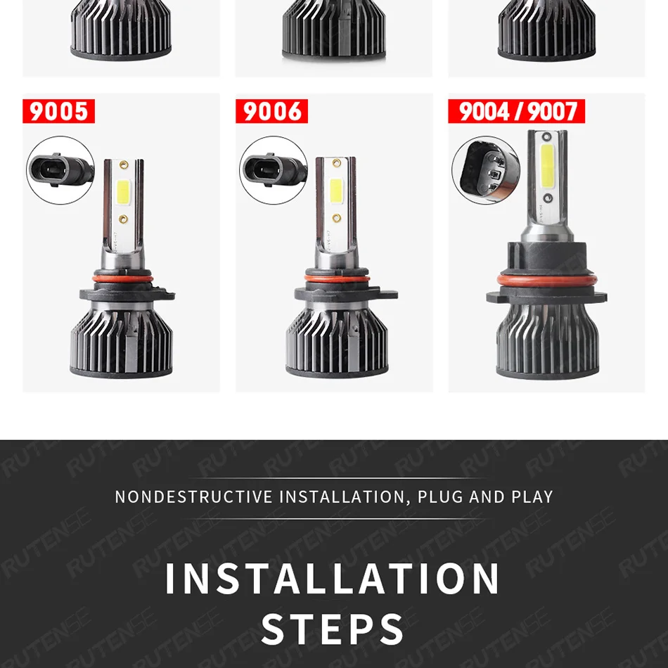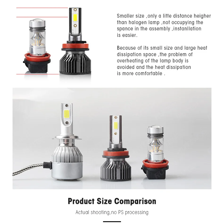 Параметры продукта: 1. Мощность: 72 Вт/комплект 2. Лампы: COB 3. Напряжение: 9-36 в, 4. Срок службы: >50000 часов (часов) 5. Цветовая температура (цвет): 6000K 6. Люмен (яркость): 6000LM 7. Светодиодные модели: H1, H3, 880/881/H27, H7, H11/H8/H9, 9005/HB3/H10, 9006/HB4, H4/HB2/9003, 9004/HB1, 9007/HB5, H13/9008 8. Подходит для: