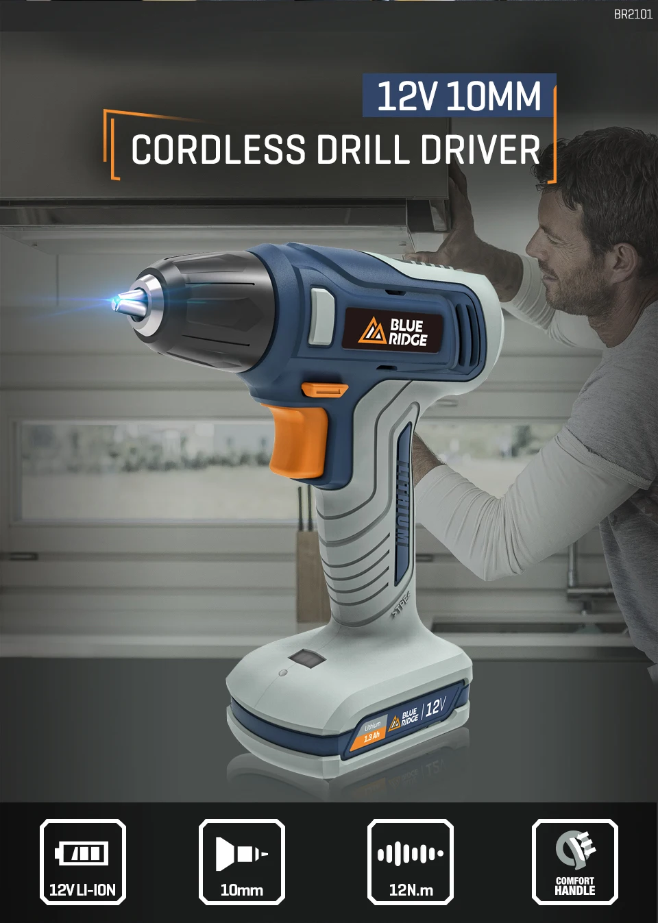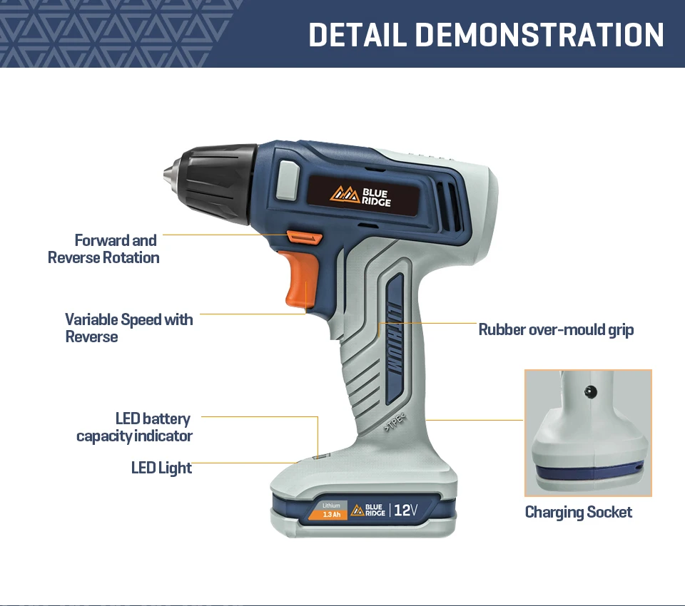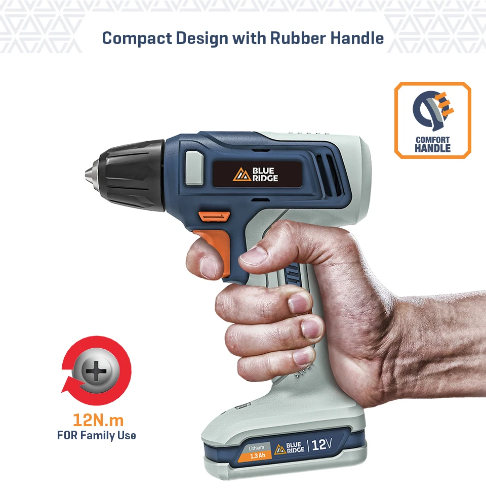 Шуруповерт BLUERIDGE 12 В, шуруповерт, литий-ионный аккумулятор, Мини электрическая дрель BR2101, 10 мм, бескнопочный патрон, 13 шт.