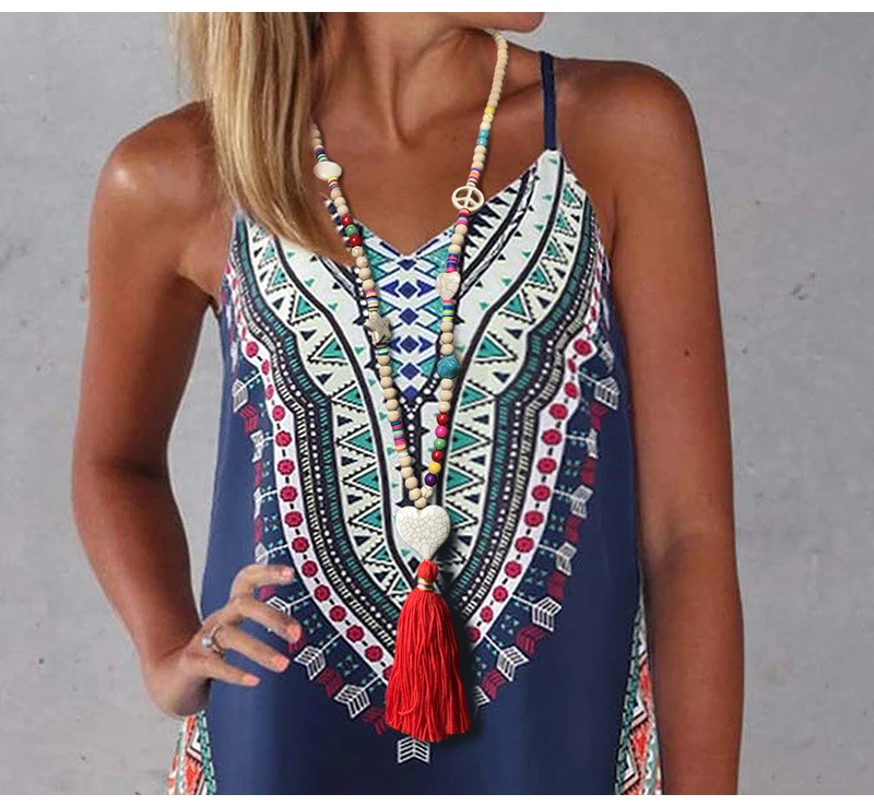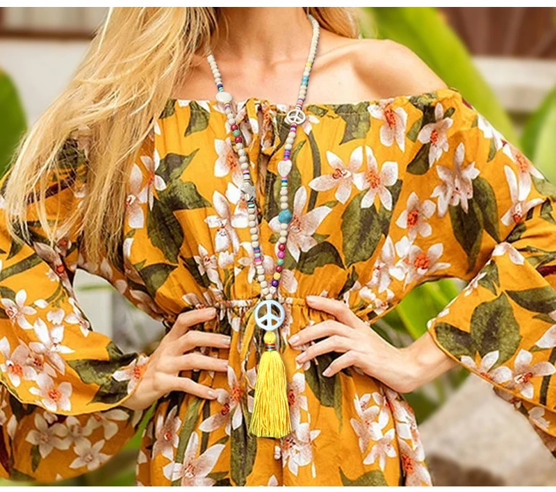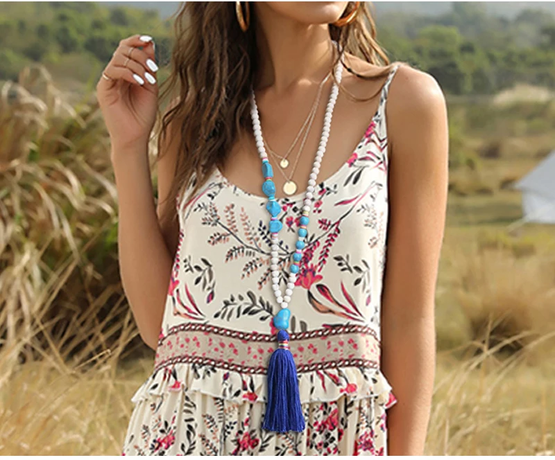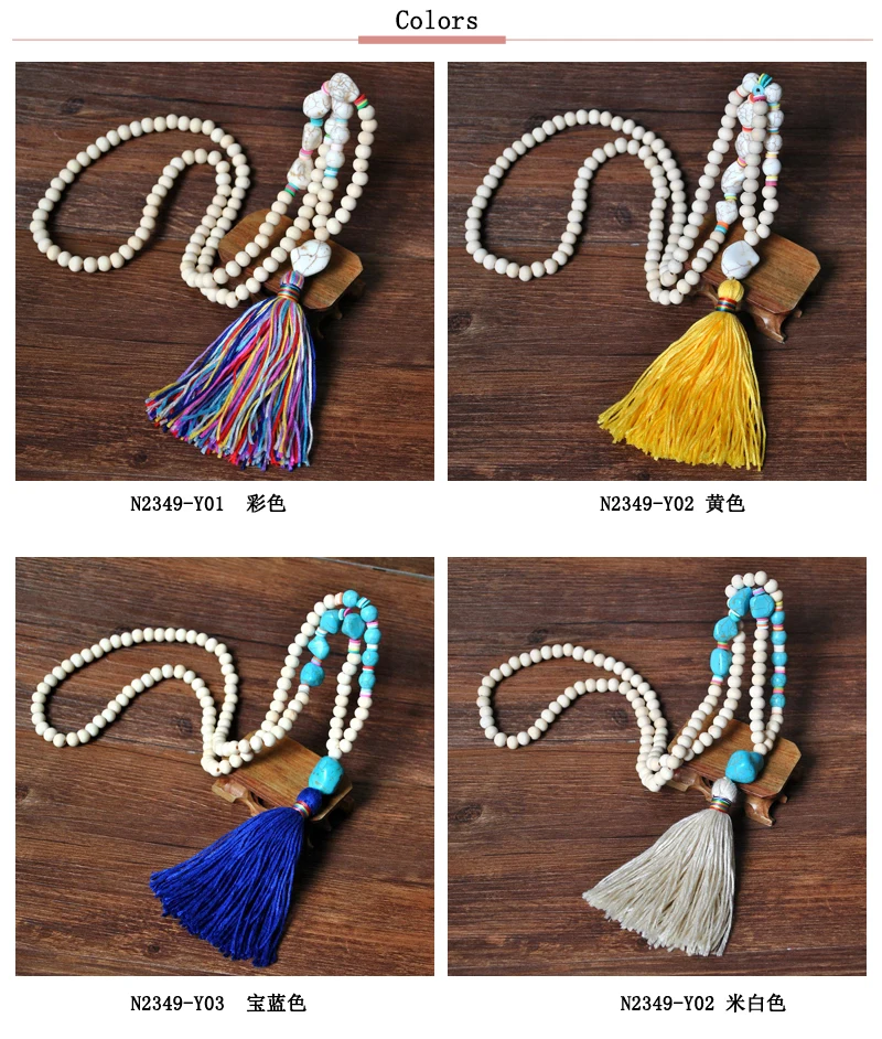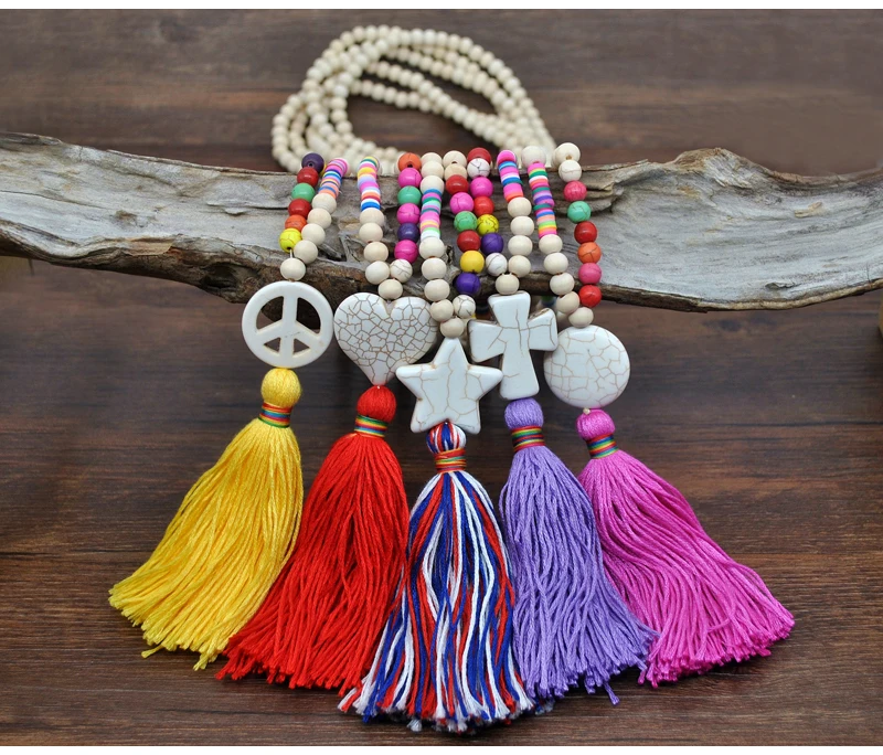 Ожерелье изготовлено из синтетической бирюзовой полимерной глины с деревянными бусинами и длинными кисточками. В наличии разные цвета и формы на выбор