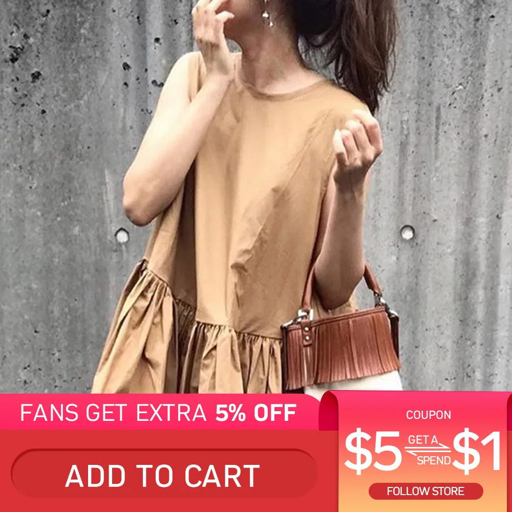 Женские коричневые футболки без рукавов Лето 2020 корейский плиссированный пуловер Топы Блузки повседневные офисные женские рубашки блузки Япония