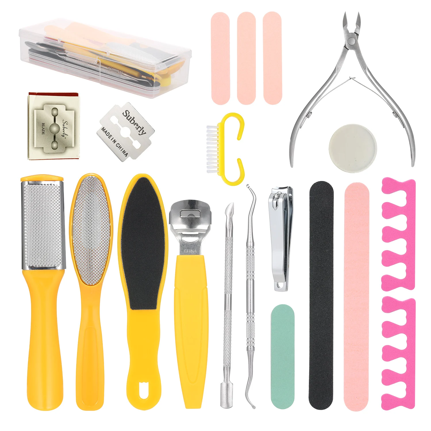 Набор из 20 штук, включая кусачки для ногтей, кусачки для омертвевшей кожи, полировочные полоски, полировальные полоски * 5, пилочка для ног * 2, строгальный станок для ног, двойной песочный пилочка, стальная лопатка для ногтей, бритва для ногтей, держатель для пальцев * 2, чистящая щетка, силиконовые прокладки, лезвия, ящики для хранения, Полный набор комбинаций для использования.