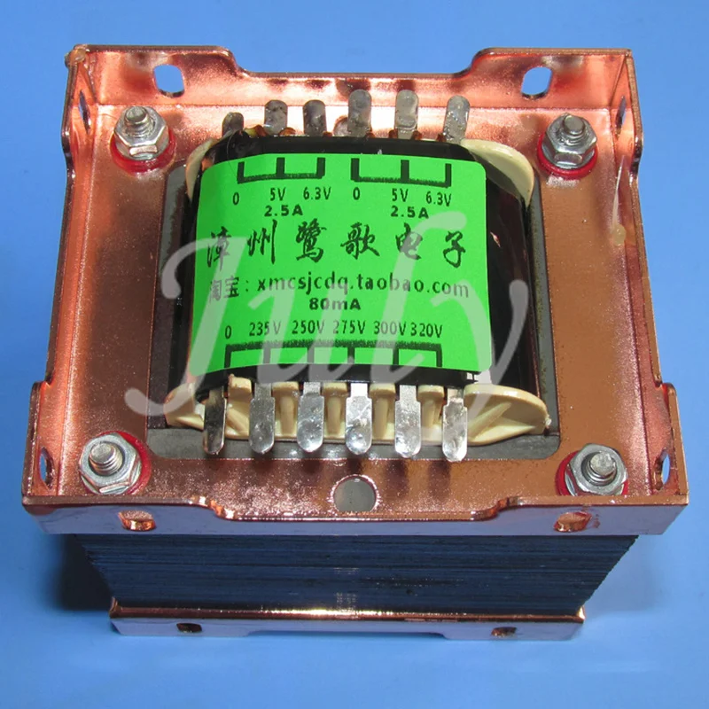 Размер железного сердечника трансформатора: высокая ширина 76, толщина 64, 50 мм. Вход: 0 ~ 220 В ~ 235 в, GND экранированный исходящий провод. Выход: 0 ~ 235V ~ 250V ~ 275V ~ 300V ~ 320V 80mA, 0 ~ 5V ~ 6,3 V 3A, 0 ~ 5V ~ 6,3 V 3A, 0 ~ 6,3 V 2A, 0 ~ 6,3 V 2A, тяжелый, весит около 1,9Kg. При использовании устройства две группы 0 ~ 5V ~ 6,3 V 3A и 0 ~ 5V ~ 6,3 V 3A может использоваться в серии 10V или 11,3 V или 12,6 V в соответствии с потребностями. Нормальная рабочая температура не выше 25 градусов (температура удушья + Температура окружающей среды), 1000 В испытание на Высокое напряжение в течение 1 минуты.