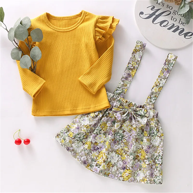 Комплект одежды из 2 предметов для маленьких девочек однотонный топ с длинными рукавами и круглым вырезом и оборками комплект с юбкой на подтяжках с цветочным узором и бантом