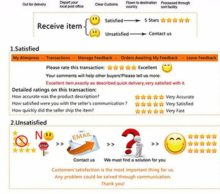 1. Если вы получили дефектный продукт или вы не удовлетворены товаром, пожалуйста, не стесняйтесь связаться с нами, мы сделаем все возможное, чтобы обслуживать вас в течение 24 часов. 2. Отзывы-наша репутация. Мы стремимся к отличному удовлетворительному обслуживанию и продолжаем иметь чрезвычайно положительные отзывы. 3. Если по какой-либо причине вы не удовлетворены, пожалуйста, свяжитесь с нами, прежде чем оставлять отзывы, чтобы устранить любые расхождения, которые могут возникнуть у вас. 4. Мы заботимся о каждой неудовлетворенности, пожалуйста, не оставляйте негативные отзывы, прежде чем связаться с нами. Мы решим все проблемы для вас и приложим все усилия, чтобы соответствовать пяти звездам. 5. Ваше удовлетворение является нашим приоритетом, если вы удовлетворены нами, пожалуйста, оставьте нам пять звезд и положительные отзывы.