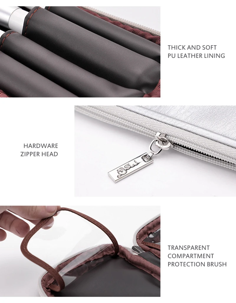 Сумка для кистей для макияжа является водонепроницаемой и легко моется. Подкладка из искусственной кожи плотная и мягкая. Двухсторонний-пулер ограничитель молнии оборудования ослепительный и простых в использовании. Прозрачный отсек хорошо защищает кисть.