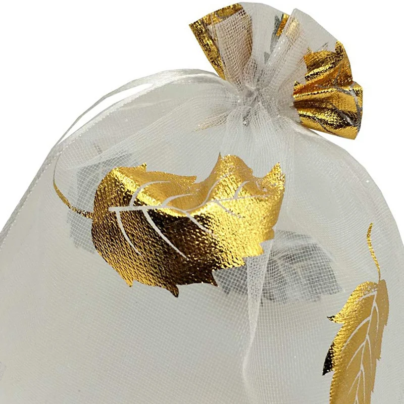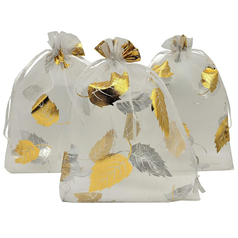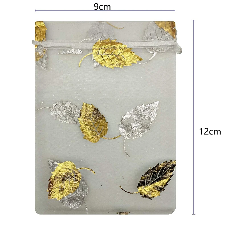 100 шт. 9X12cm Подарочный мешочек из органзы для ювелирных изделий конфетный мешочек на шнурке свадебные сумки (серебристо-золотой лист)