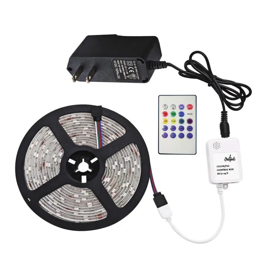 Посылка включает в себя: 5 м/16,4 фута --- 1*5 метров/рулон RGB светодиодный светильник, 12 В Входное напряжение постоянного тока, С двойными концами соединительного кабеля, Двухсторонняя клейкая лента, IP20 не водонепроницаемая Устройство управления синхронизацией музыки с пультом дистанционного управления с 20 кнопками (без аккумулятора), 100-240 В Входное напряжение переменного тока -- адаптер питания -- 12 В Выходное напряжение постоянного тока -- С штепсельной вилкой ЕС или штепсельной вилкой Великобритании или штепсельной вилкой США