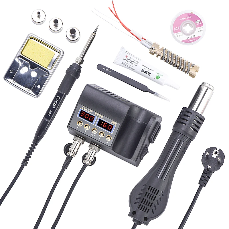 Нагреватель горячего воздуха и сварочный Утюг 2в1 паяльная станция. Двойные цифровые ЖК-дисплеи для отображения точной температуры. Чрезвычайно низкий уровень шума и компактный дизайн. Функция интеллектуального самообнаружения обеспечивает безопасную персональную работу. Функция автоматического охлаждения для эффективного продления срока службы нагревателя и защиты нагревателя горячего воздуха. Пистолет горячего воздуха Рабочее напряжение: AC220-240V или AC100-130V Частота: 50 Гц/60 Гц Выходная мощность: 800 Вт Диапазон температур: 100 °C ~ 480 °C Стабильность температуры: ± 2 ℃ Поток воздуха: 150 л/мин (макс.) Паяльник Рабочее напряжение: AC220-240V или AC100-130V Выходная мощность: 80 Вт Частота: 50 Гц/60 Гц Диапазон температур: 180 °C-500 °C Стабильность температуры: ± 1 °C Паяльник: дизайн ESD Нагреватель Материал: керамика Инструкции по использованию: 1. Очистите электронные компоненты для пайки. 2. Как только железо достигнет температуры (не слишком высокий, рекомендуется 300-400 ℃). 3. Нанесите немного припоя на нагреваемый железный наконечник, чтобы предотвратить окисление, затем протрите железный наконечник, чтобы равномерно продлить припой на поверхность железного наконечника. 4. Начните паять