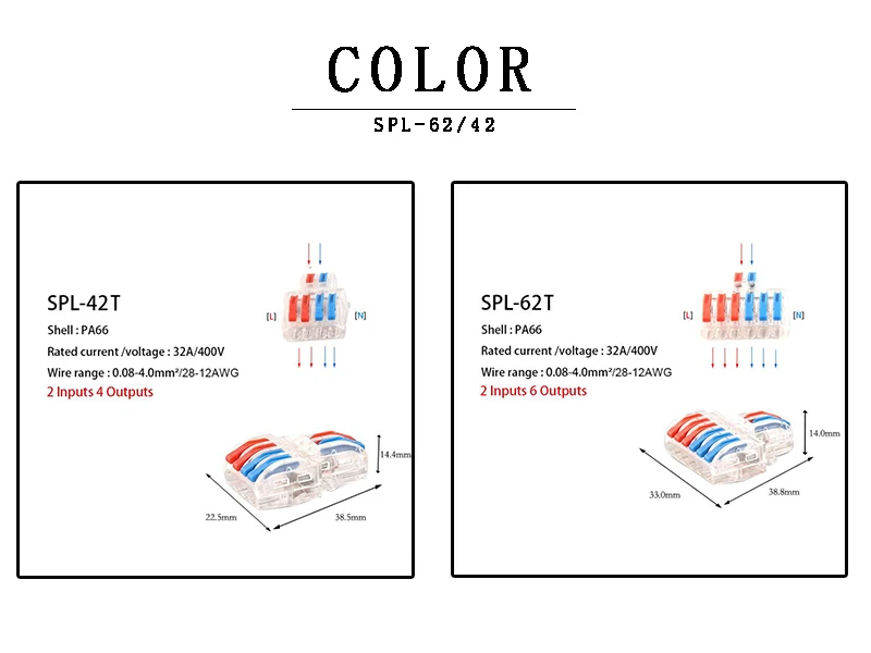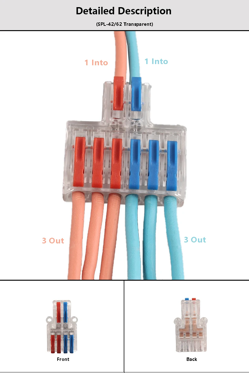 SPL 42T/62T Универсальный соединитель кабеля проводки прозрачный тип быстрый соединитель проводов нажимной клеммный блок проводника Корпус: PA66 Модель: SPL-42T/62T Номинальный ток: 32A Номинальное напряжение: 400 В Твердые/многожильный: 0,08-4.0mm см²/28-12AWG 2 входа 4 выхода 2 входа 6 выходов