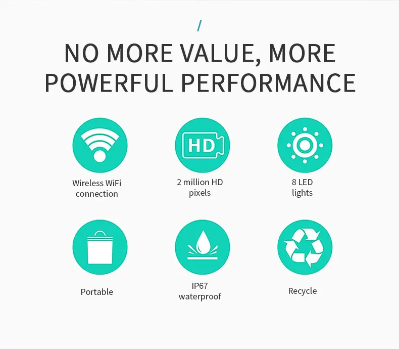 Коэффициент разрешения: 1920x1080 Пиксель датчика: 2 миллиона Время работы: около 2 часов Время зарядки: около 2 часов Датчик изображения: CMOS Рабочая температура: 0-45 градусов по Цельсию Угол обзора: 70 Фокусное расстояние: 1-2 см (самое лучшее) Светильник: 8 регулируемый светодиодный светильник s Уровень водонепроницаемости: IP67 (только для объектива) Частота: 2,4 ГГц Емкость аккумулятора: 1000 мАч Система поддержки: выше IOS 8,0/выше Android 4,2