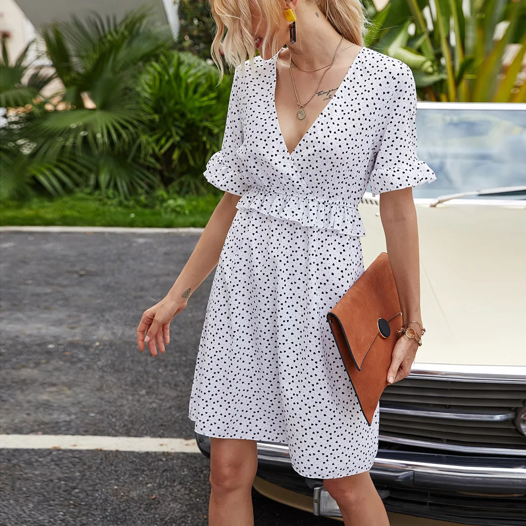 Модное женское Повседневное платье с цветочным принтом и v-образным вырезом с коротким рукавом и оборками