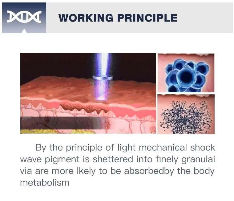 Лазерное оборудование для татуировок использует режим Q switch, который использует мгновенный излучаемый лазер, чтобы сломать пигмент в плохой конструкции. Это лазерная мгновенная emit Теория: централизованная высокая энергия испускает неожиданно, что делает лазер оседлого волнового диапазона в-стантанно проникает через кутикулу до больной структуры в 6 НС, И быстро сломать соответствующие пигменты. После поглощения тепла, пигменты разбухнут и сломаются, некоторые пигменты (в коже-глубокая кутикула) сразу же отлетают от тела, и другие пигменты (глубокая структура) сломайте, затем станьте крошечной гранулой, которая может быть облищена клеткой, переваривается и удаляется от продажи лимфы. Затем пигменты в больной структуре светлеют, чтобы исчезнуть. Более того, лазер не повреждает кожу вокруг.