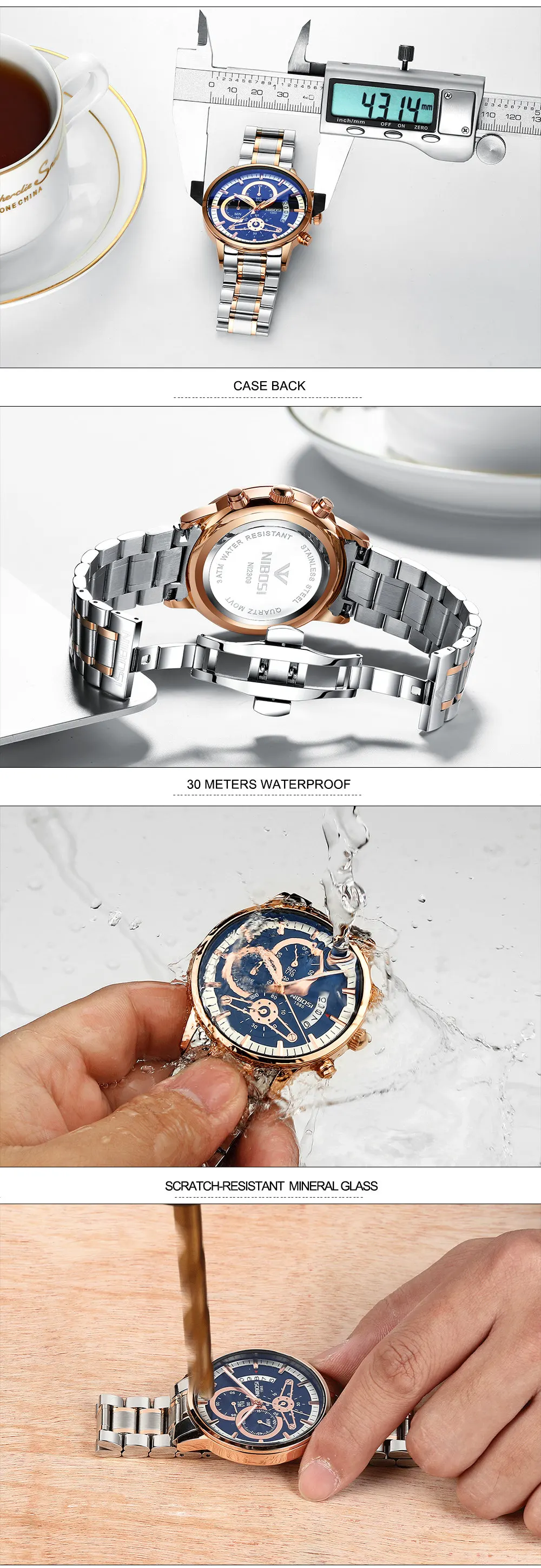 Бренд: NIBOSI Модель: NI2379 Диаметр циферблата: 44 мм Толщина корпуса: 13 мм Ширина ремешка: 22 мм Длина Часов: 240 мм Вес часов: 144 г Механизм: кварцевый механизм Чехол: высококачественный сплав Материал ремешка: нержавеющая сталь Зеркальный Материал: Hardlex