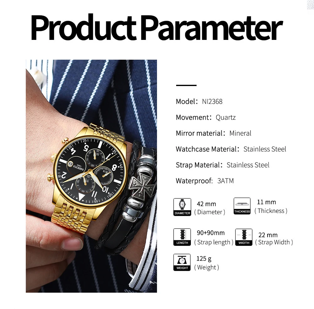 Бренд: NIBOSI Модель: NI2351 Диаметр циферблата: 44 мм Толщина корпуса: 13 мм Ширина ремешка: 20 мм Длина Часов: 240 мм Вес часов: 130 г Механизм: кварцевый механизм Чехол: высококачественный сплав Материал ремешка: нержавеющая сталь Зеркальный Материал: Hardlex