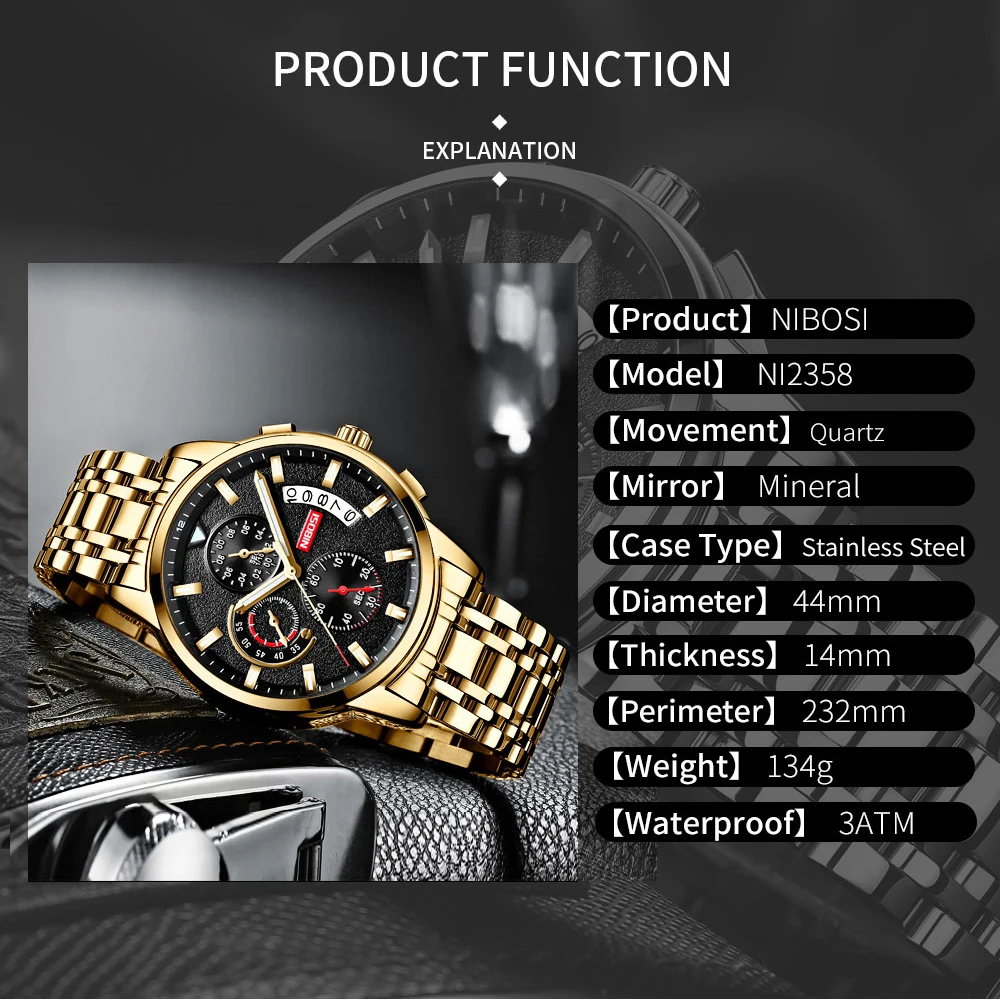 Бренд: NIBOSI Модель: NI2358 Диаметр циферблата: 44 мм Толщина корпуса: 14 мм Ширина ремешка: 20 мм Длина Часов: 230 мм Вес часов: 134 г Механизм: кварцевый механизм Чехол: высококачественный сплав Материал ремешка: нержавеющая сталь Зеркальный Материал: Hardlex