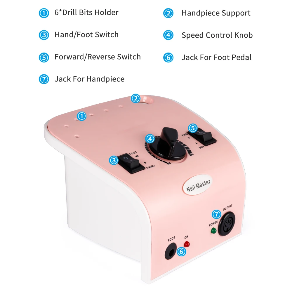 1. Новая и обновленная модель, красивый дизайн, Высококачественная пилка для маникюра и педикюра. 2. Ножная педаль включает в себя, делает лак для ногтей более легким и удобным 3. Переключатель направления вперед/назад подходит для любых правосторонних или левшей 4. Ручка из чистой меди. Стабильная работа, отсутствие тепла и низкий уровень шума. 5,0-35000 об/мин с точной коробкой управления скоростью скольжения. 6.Whith 4 сверла для ногтей. Прочная и бесвибрационная дрель для плавной работы. 7. Подходит для педикюра и маникюра, для профессионального салона или домашнего использования